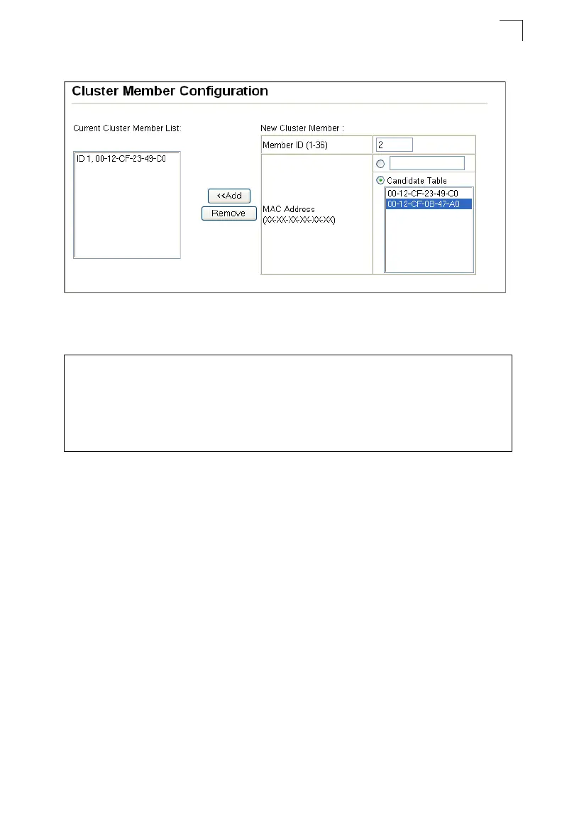 Console(config)#cluster member mac-address 00-12-34-56-78-9a id 5 4-75
