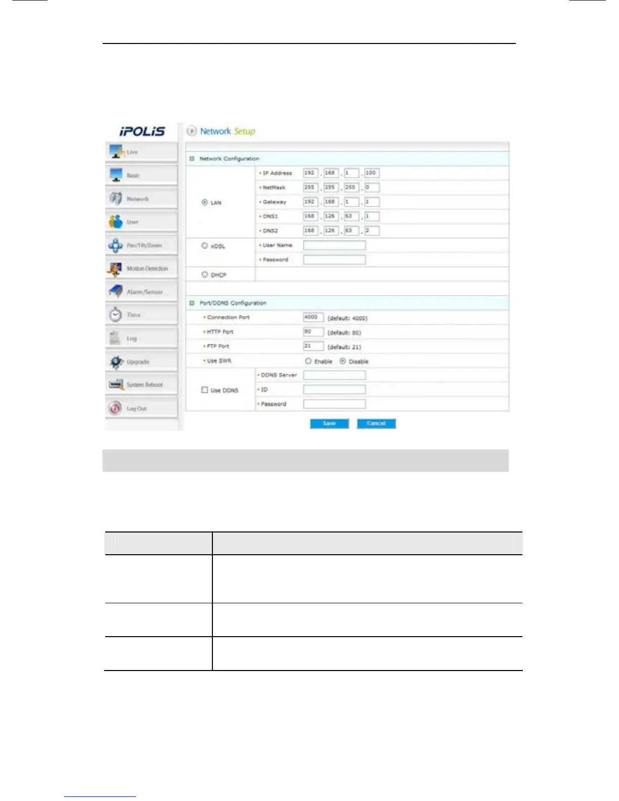 Configures network information of the camera.