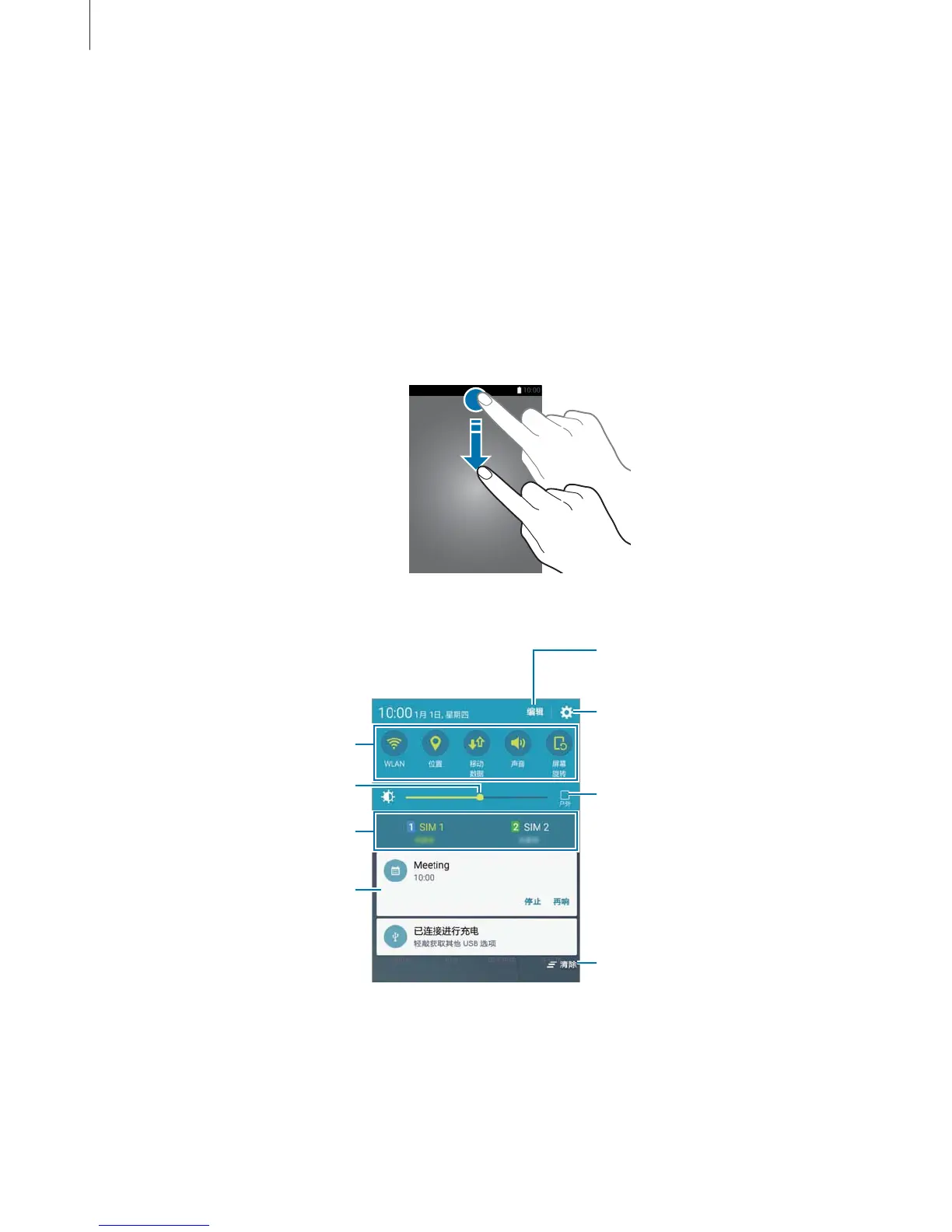 To open the notification panel, drag the status bar downwards. To close the notification panel,