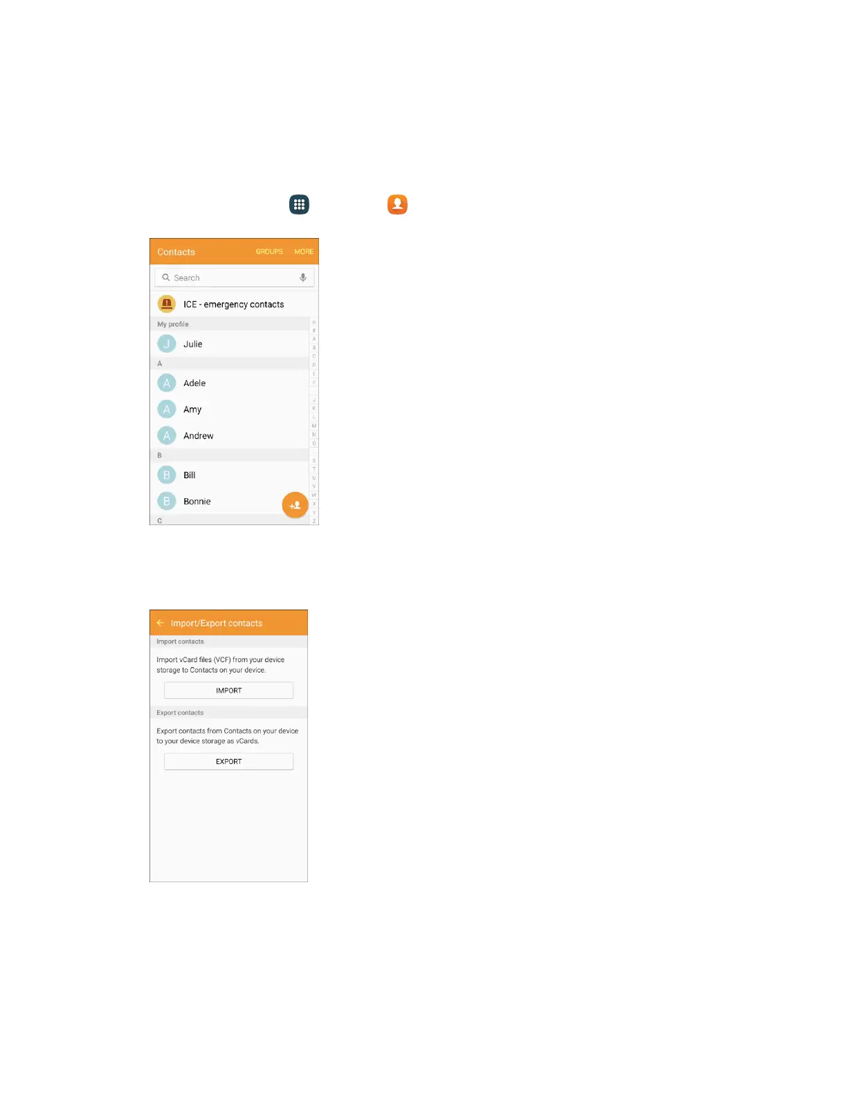 Tap More > Settings > Import/Export contacts. 2.