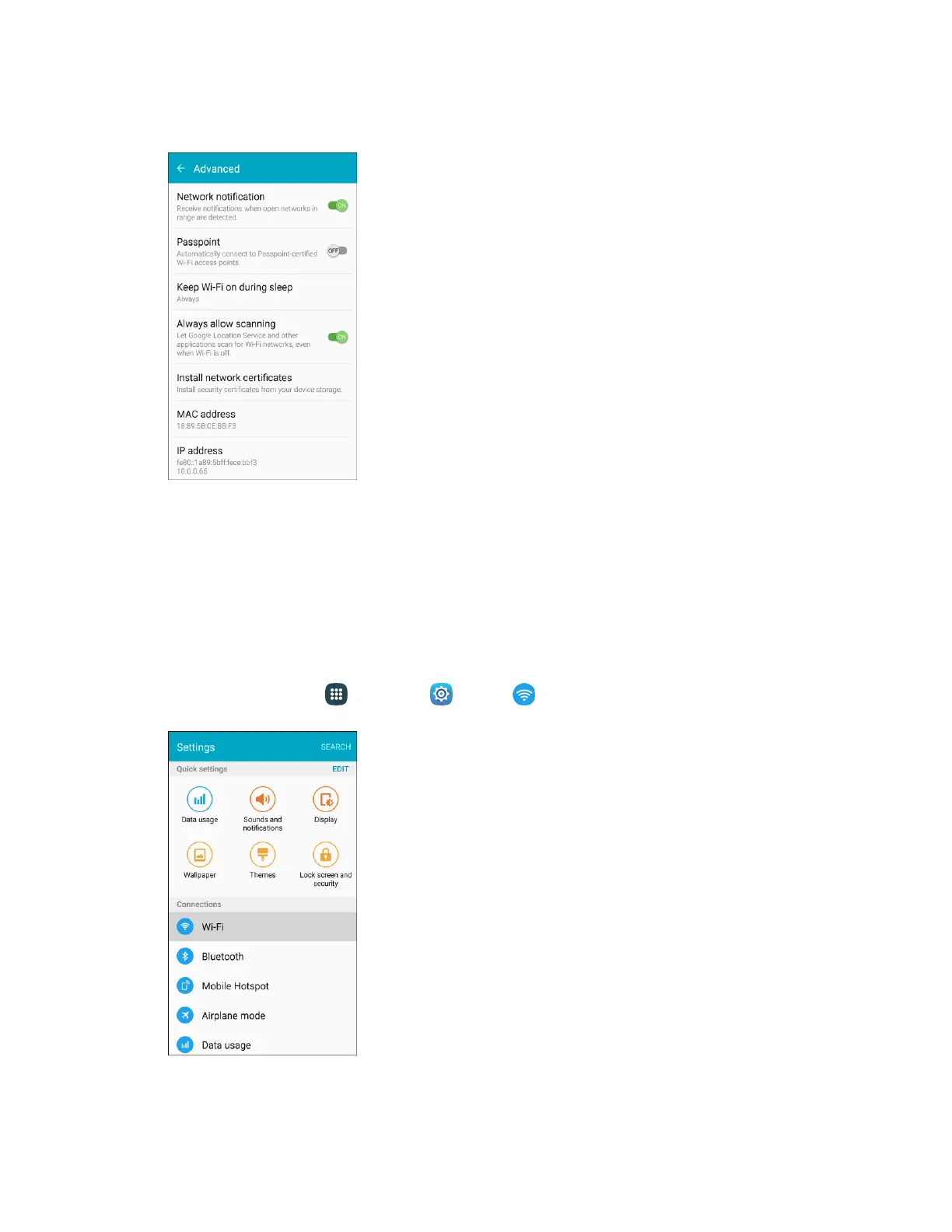 From home, tap Apps > Settings > Wi-Fi . 1.