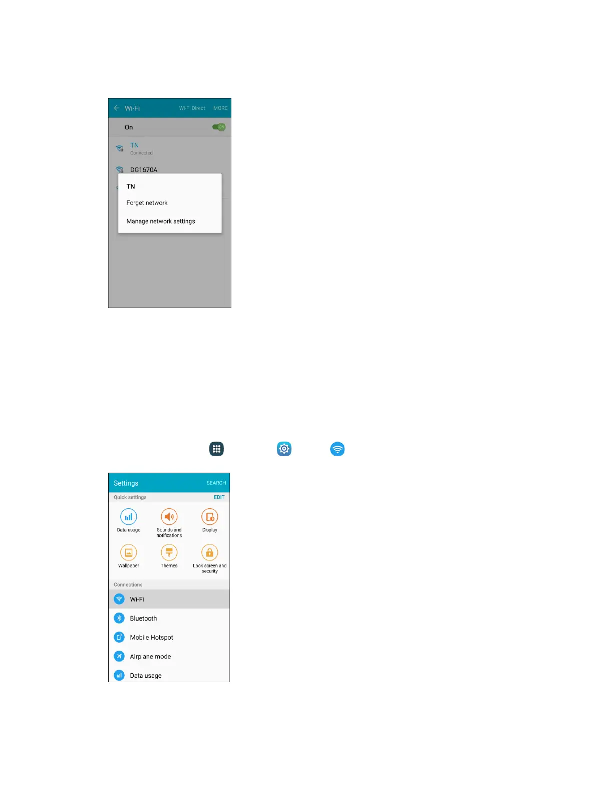 From home, tap Apps > Settings > Wi-Fi . 1.