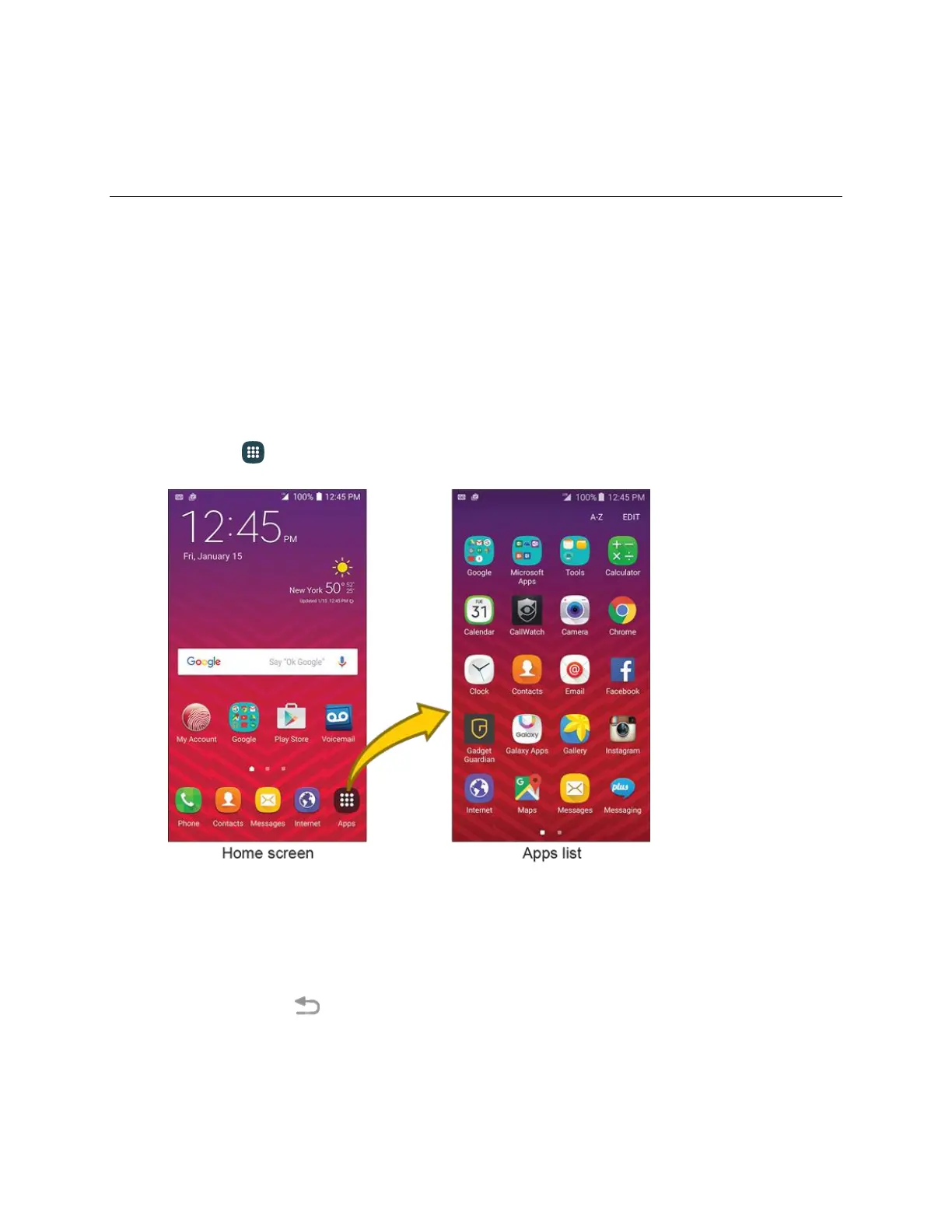 Most of your phone’s operations originate from the home screen or the apps list.