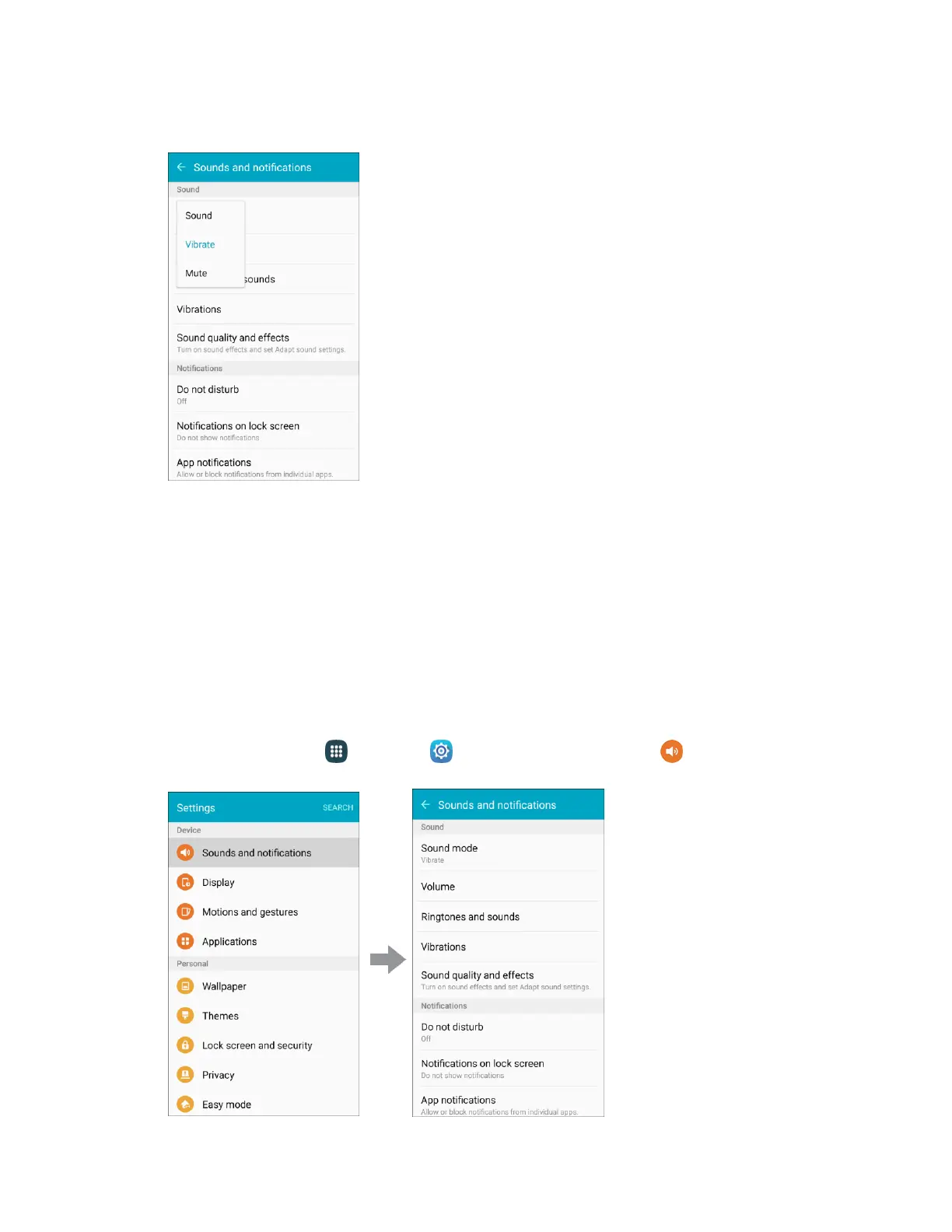 From home, tap Apps > Settings > Sounds and notifications . 1.