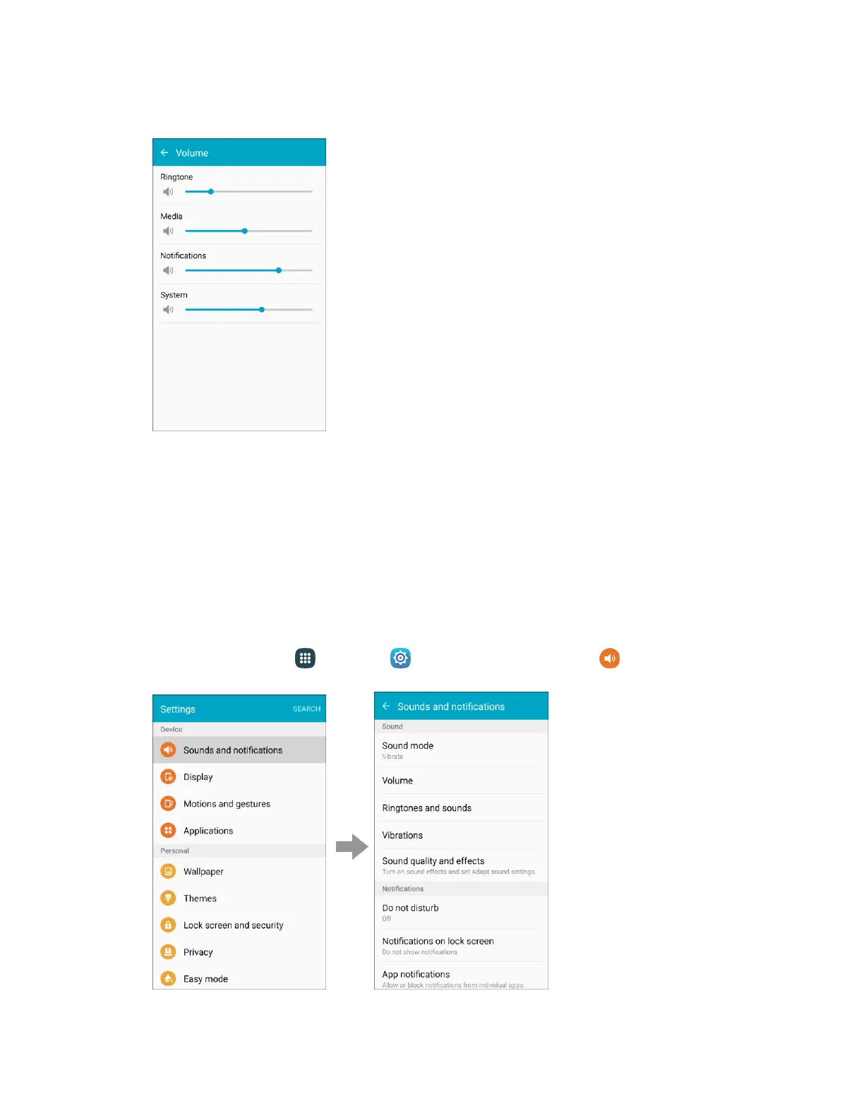 From home, tap Apps > Settings > Sounds and notifications . 1.