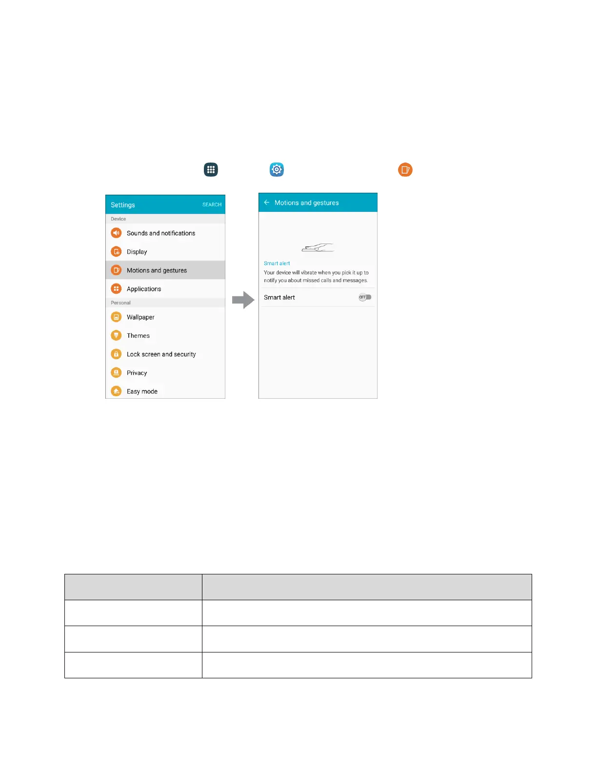 Tap ON/OFF to turn on Smart alert, which vibrates the phone when picked up to notify you about 2.