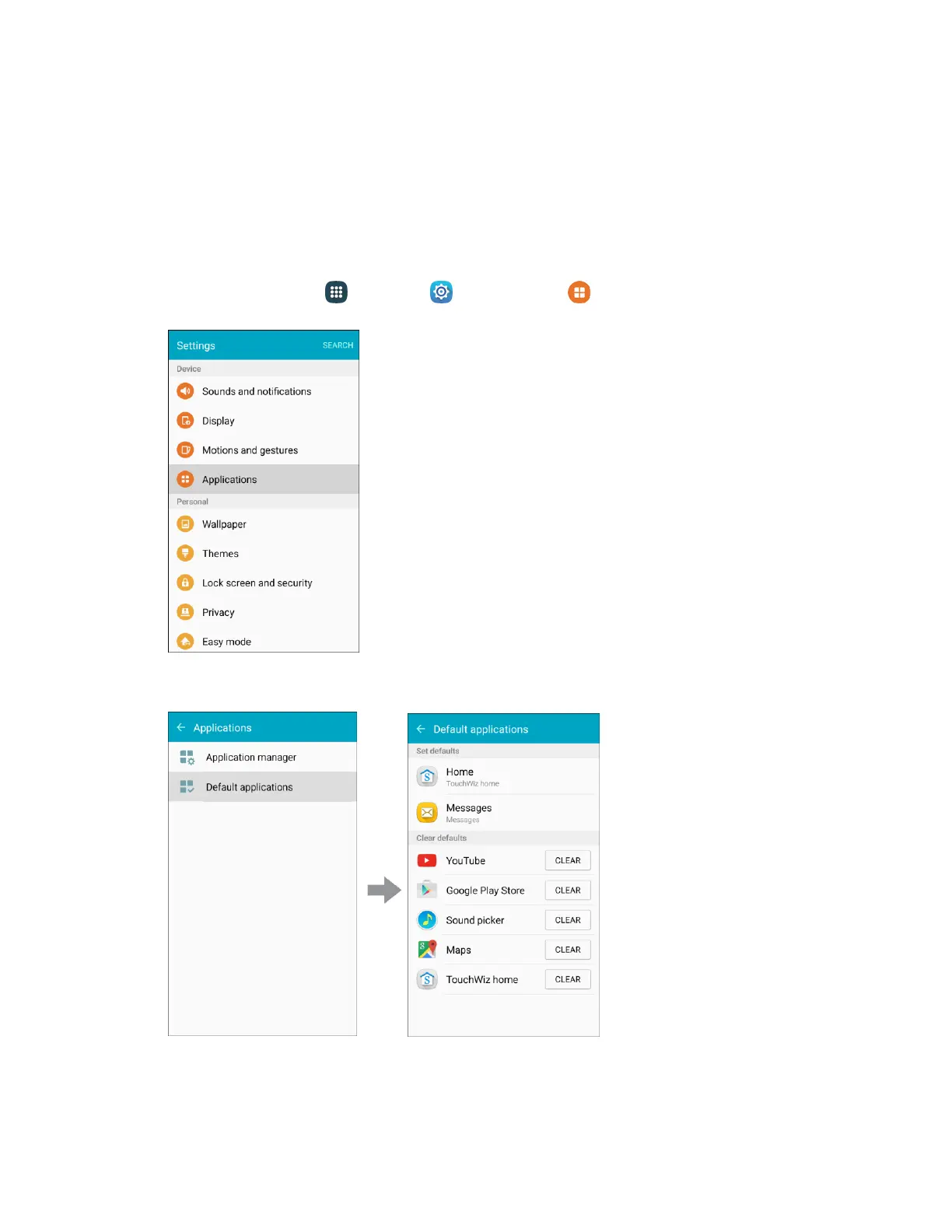 Tap each default setting to see what services or applications are available to set as the default. 3.