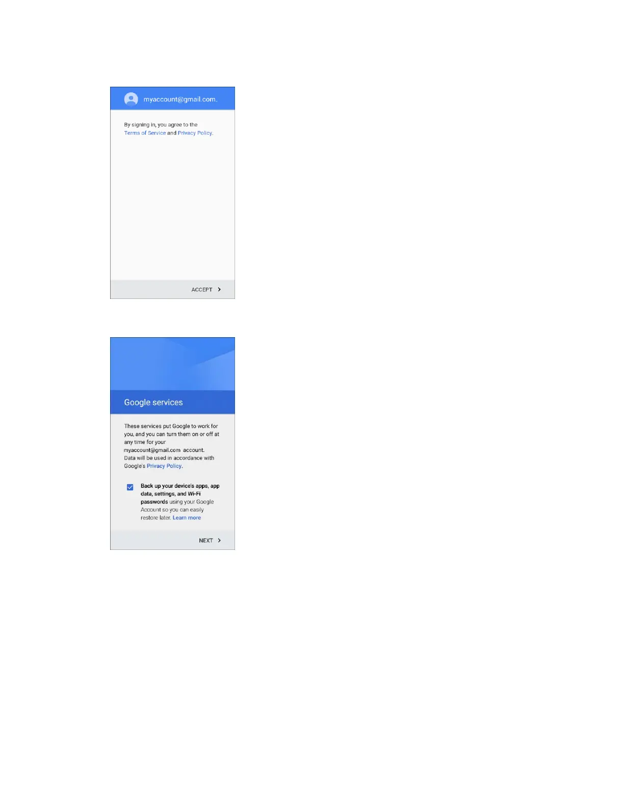 Configure your Google data backup and communication, and then tap Next. 7.
