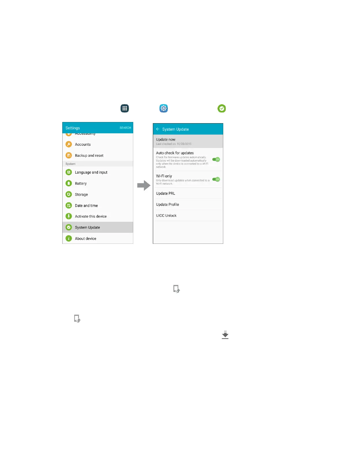 Locate the System Update Available icon in notifications. 1.