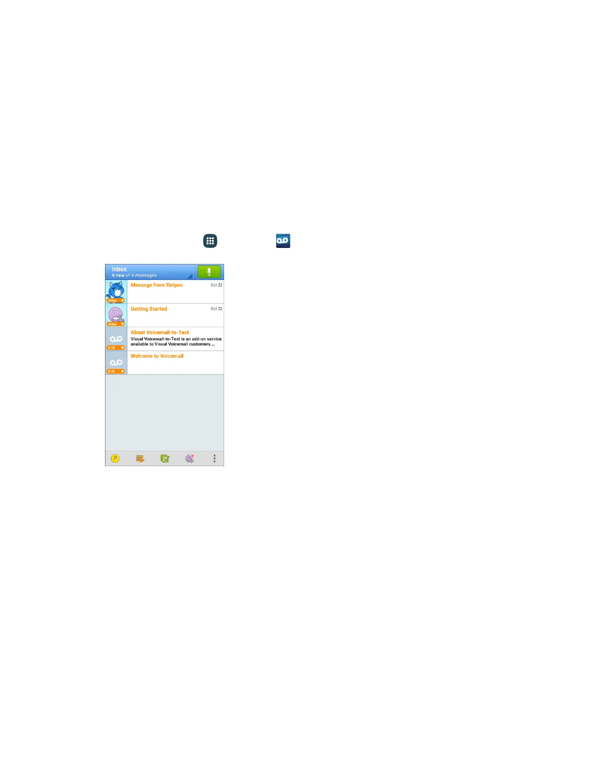 From home, tap Apps > Voicemail . 1.