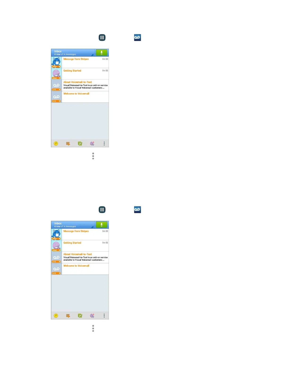 From home, tap Apps > Voicemail . 1.