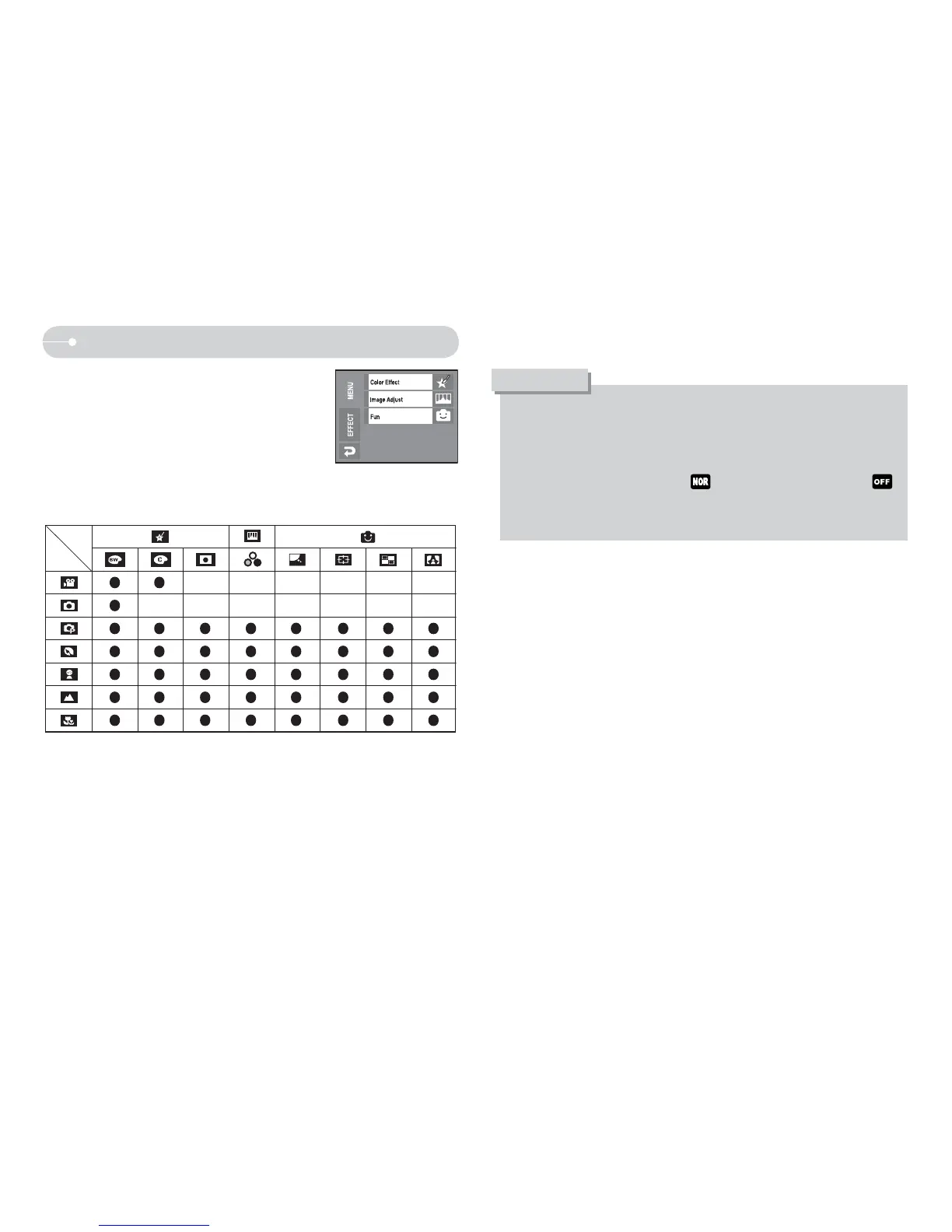 Q Available Effects, by recording mode (O : Selectable)