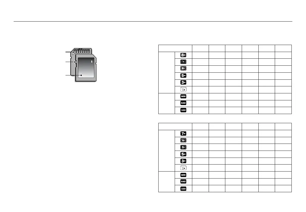 해상도와 화질별 촬영 가능 매수/시간 (256MB MMC 메모리 기준)
