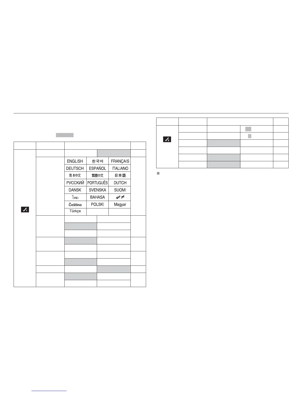 The items indicated by are default settings.