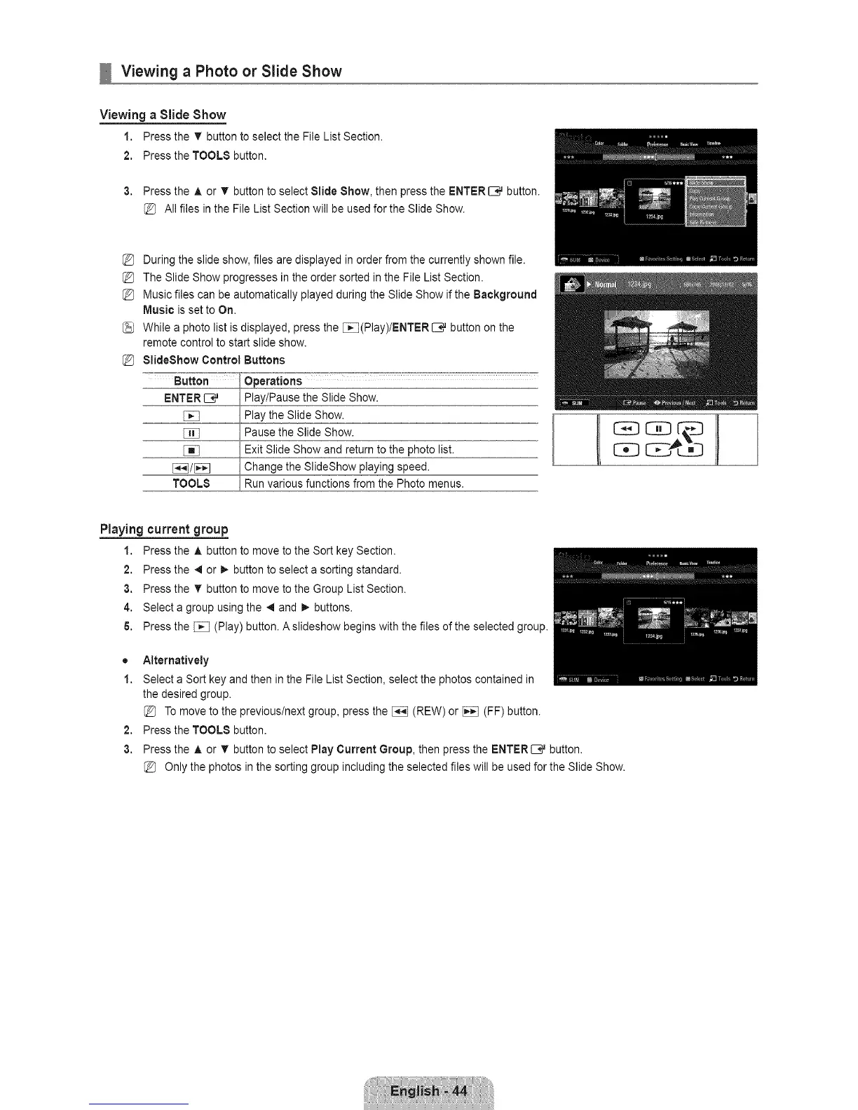 6. Press the _ (Play) button. A slideshow begins with the files of the selected group.