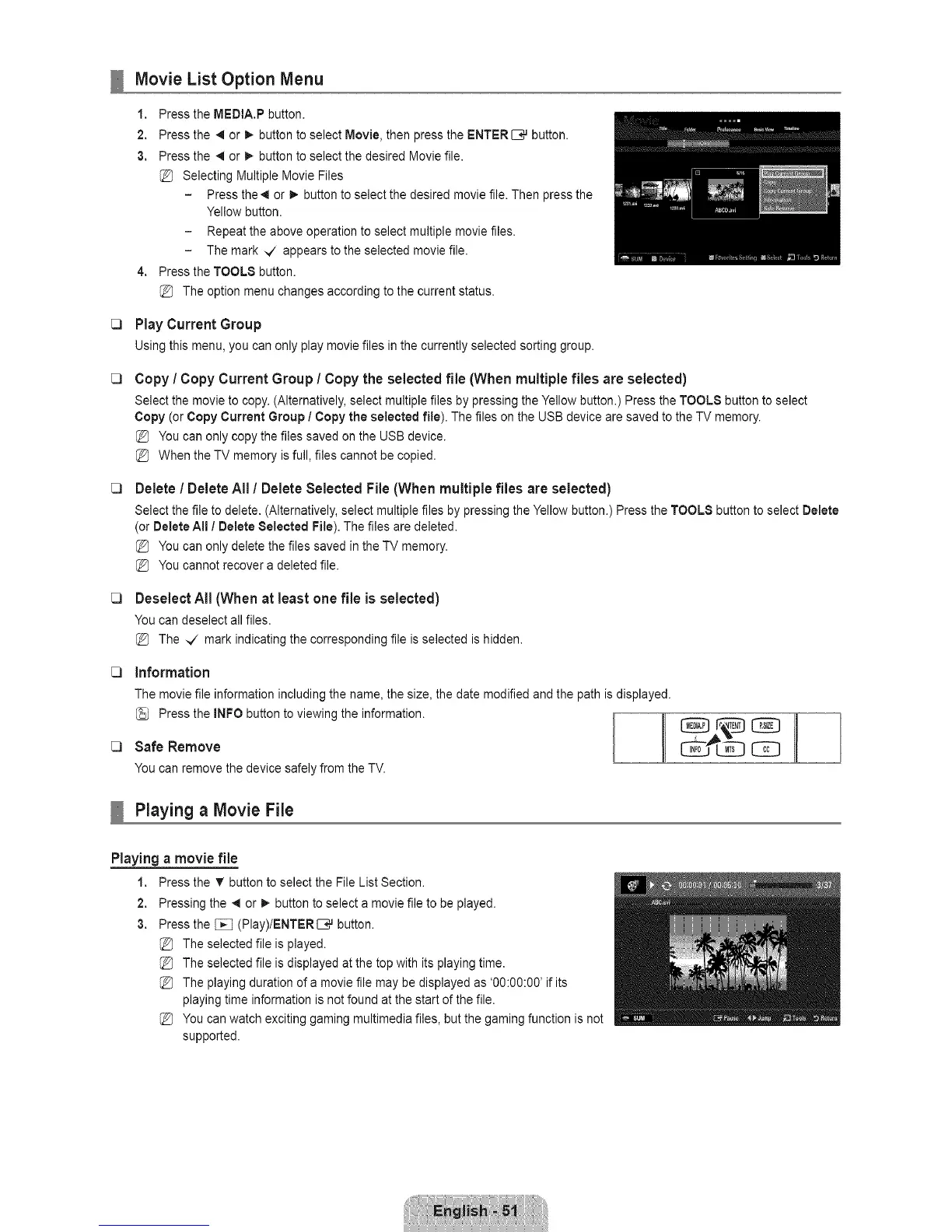 - Press the*,i or _ button to select the desired movie file. Then press the