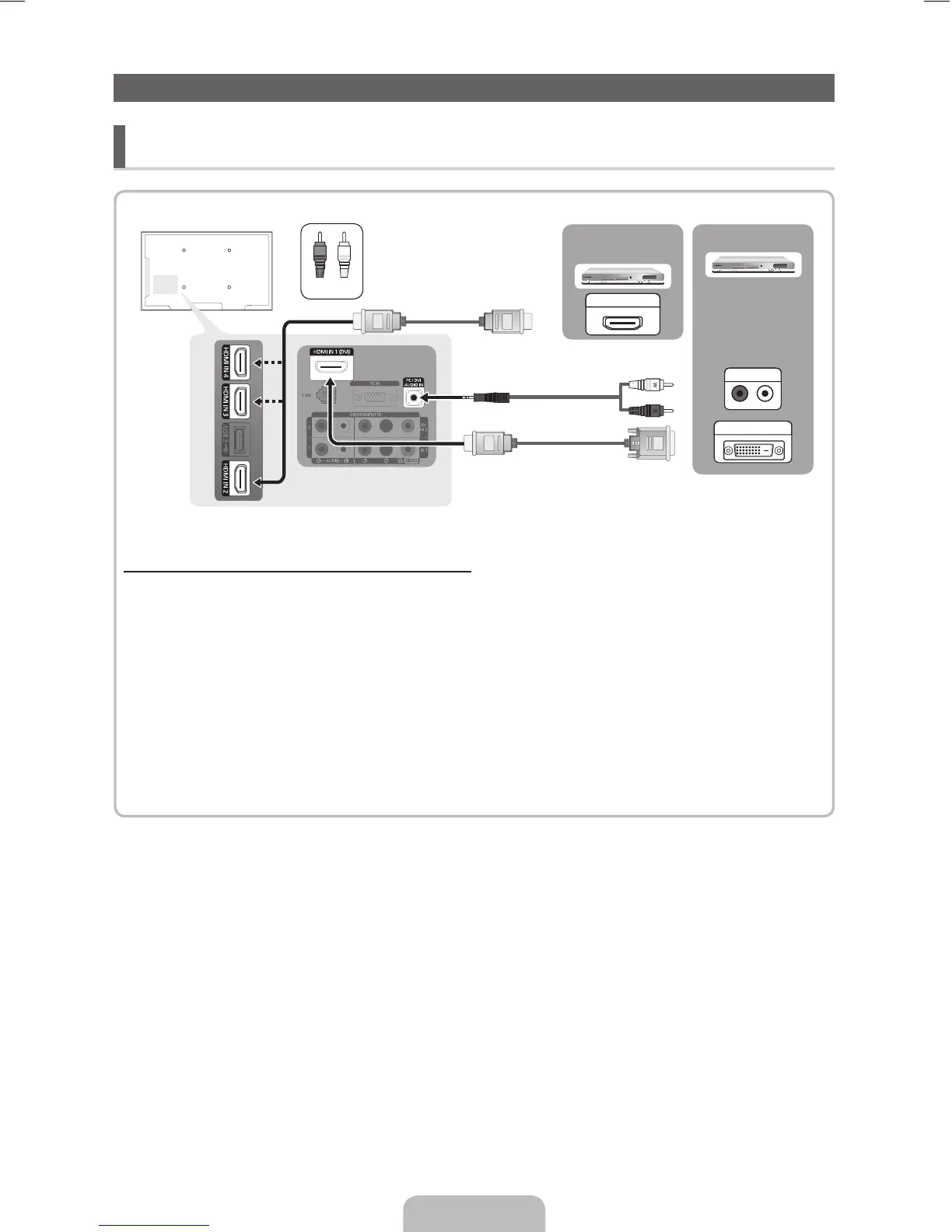 – To connect the TV to a digital device that does not support HDMI output, use an HDMI/DVI and audio cables.