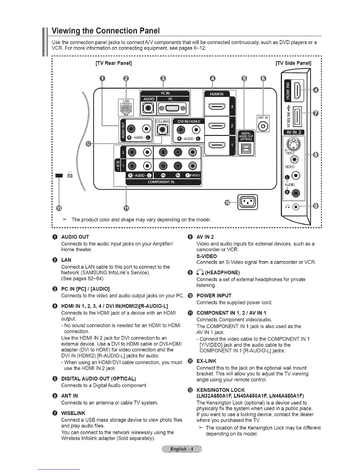 Use the connection panel jacks to connect A!V components that will be connected continuously, such as DVD players or a