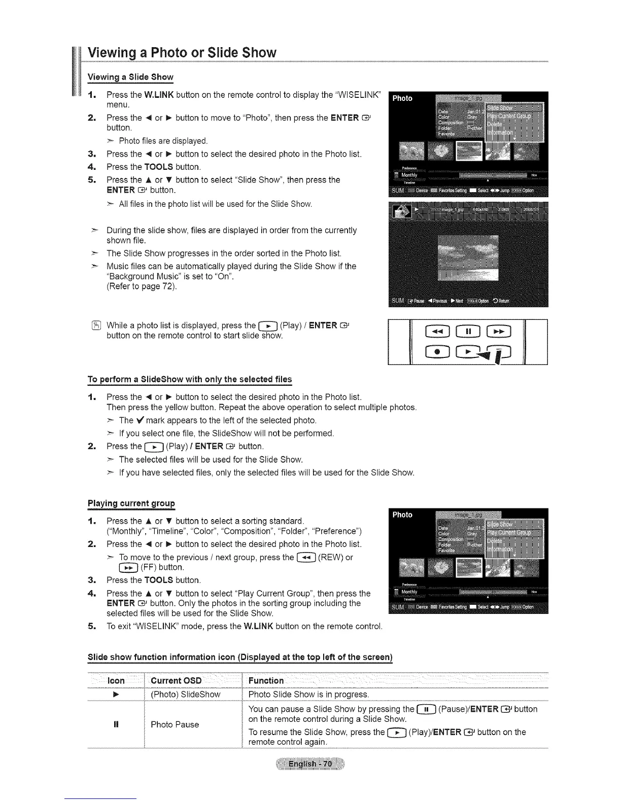 To resume the Slide Show, press the [_J (Play)/ENTER C# button on the