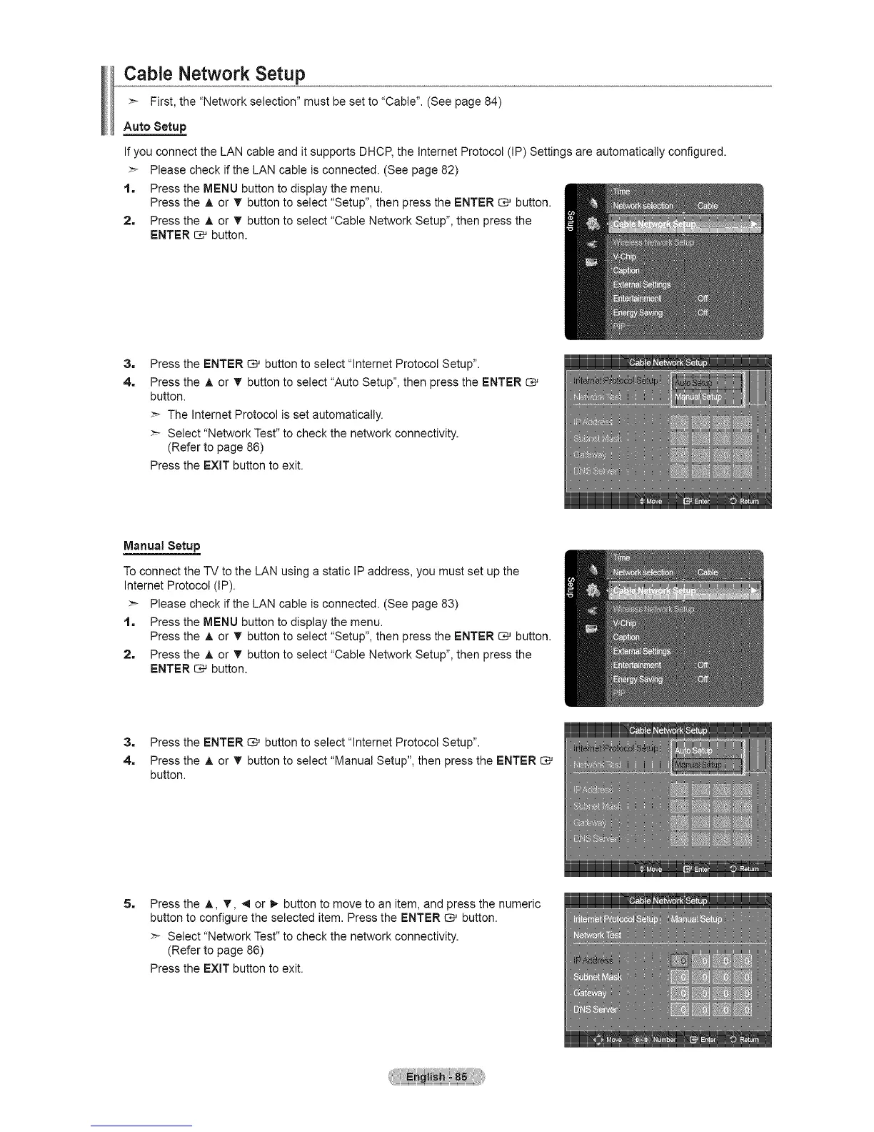 2, Press the _, or T button to select "Cable Network Setup", then press the