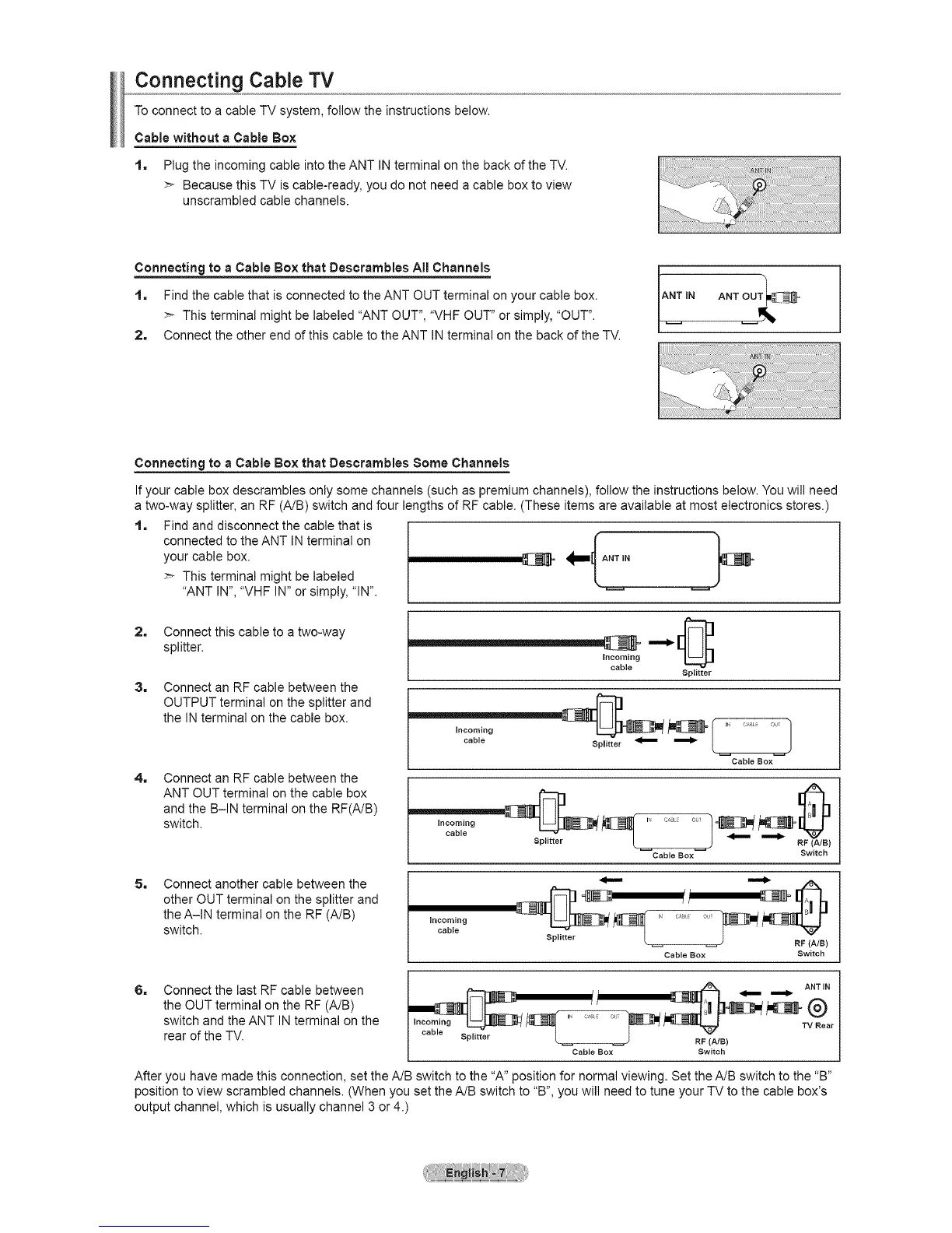 position to view scrambled channels. (When you set the A/B switch to "B", you will need to tune your TV to the cable box's