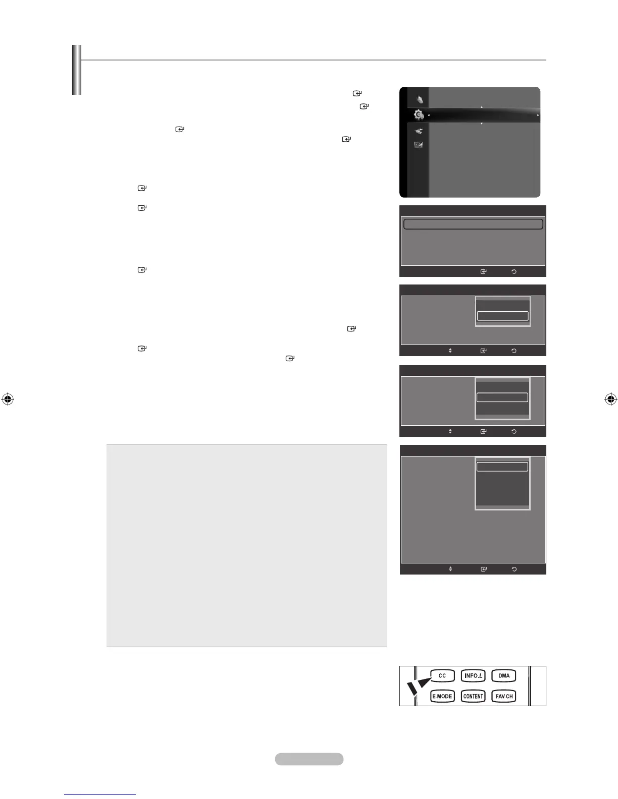 Press the CC button on the remote control to turn the Caption “On” or “Off”.