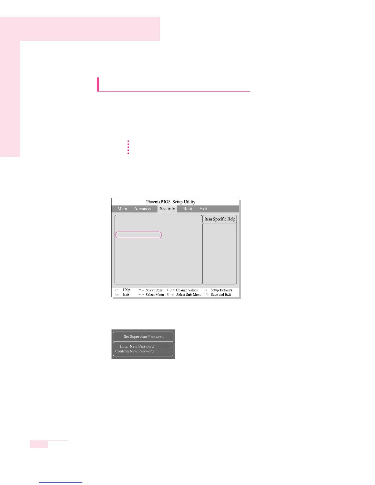 1. Select the Security menu in the System Setup. (To enter into System Setup, see