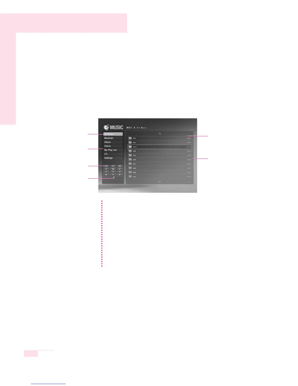 1. Select the MUSIC menu and select Category. For example, move to