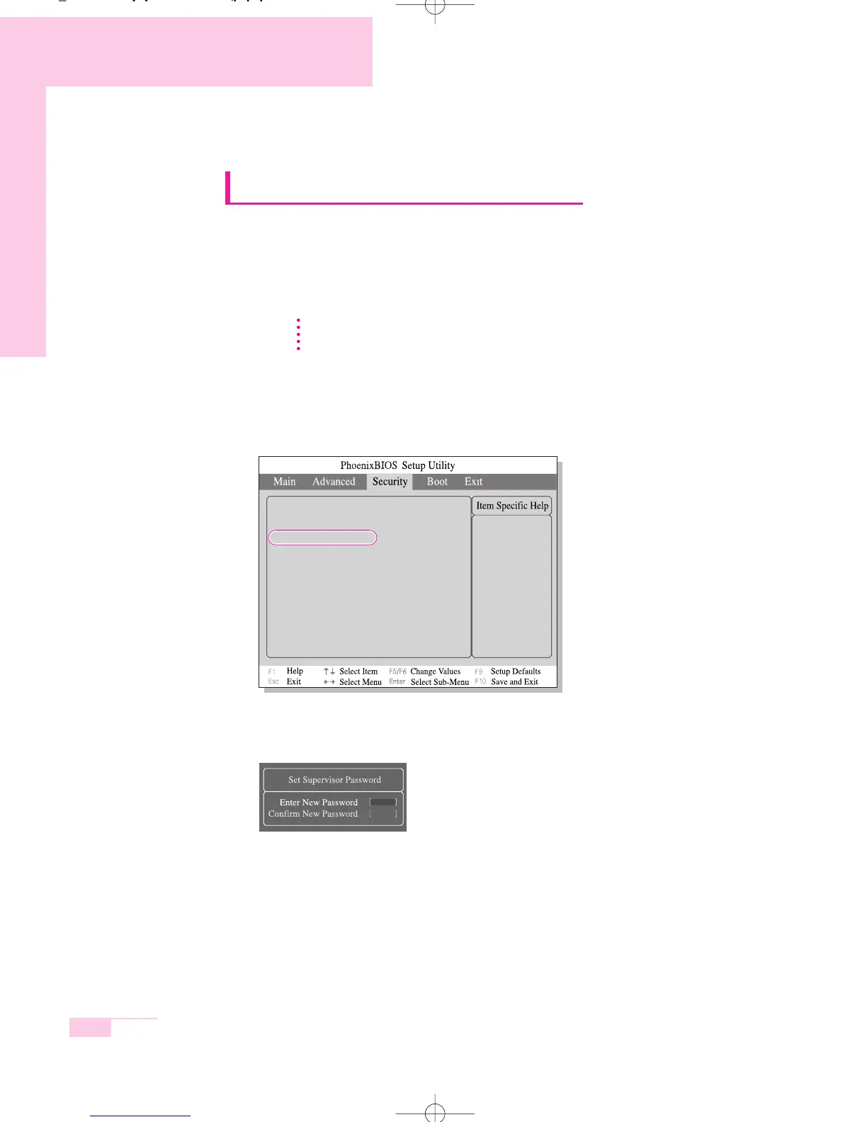 1. Select the Security menu in the System Setup. (To enter into System Setup, see