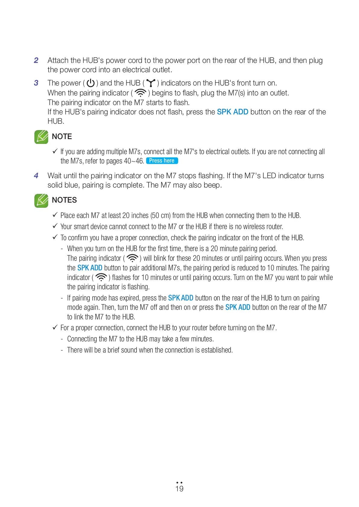 If the HUB's pairing indicator does not flash, press the SPK ADD button on the rear of the