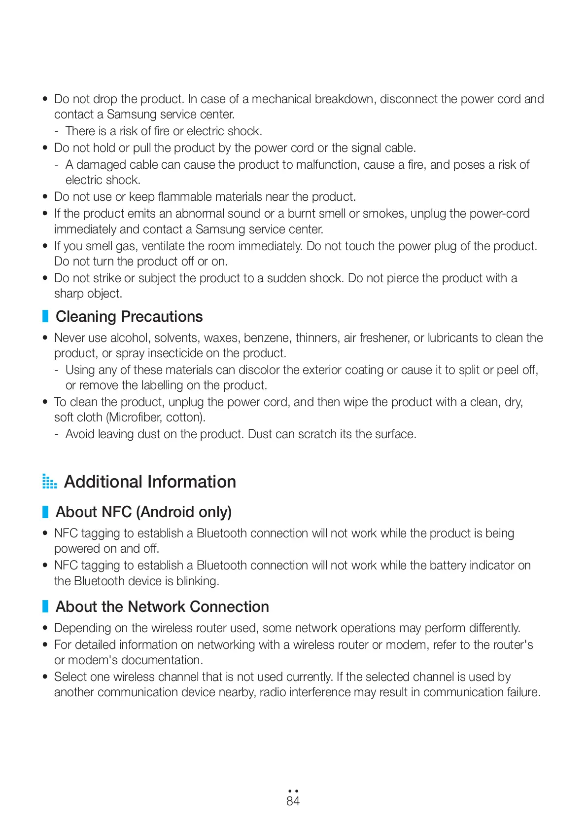 • Do not drop the product. In case of a mechanical breakdown, disconnect the power cord and