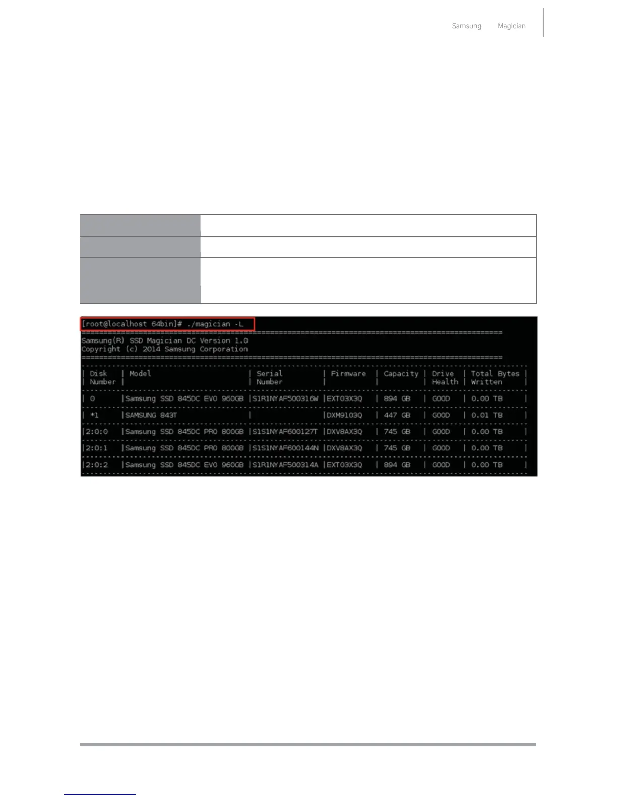The ‟L or --list option will display a list of Samsung SSDs which shows the Model Name, Firmware version, Capacity, Disk Heath, TBW,