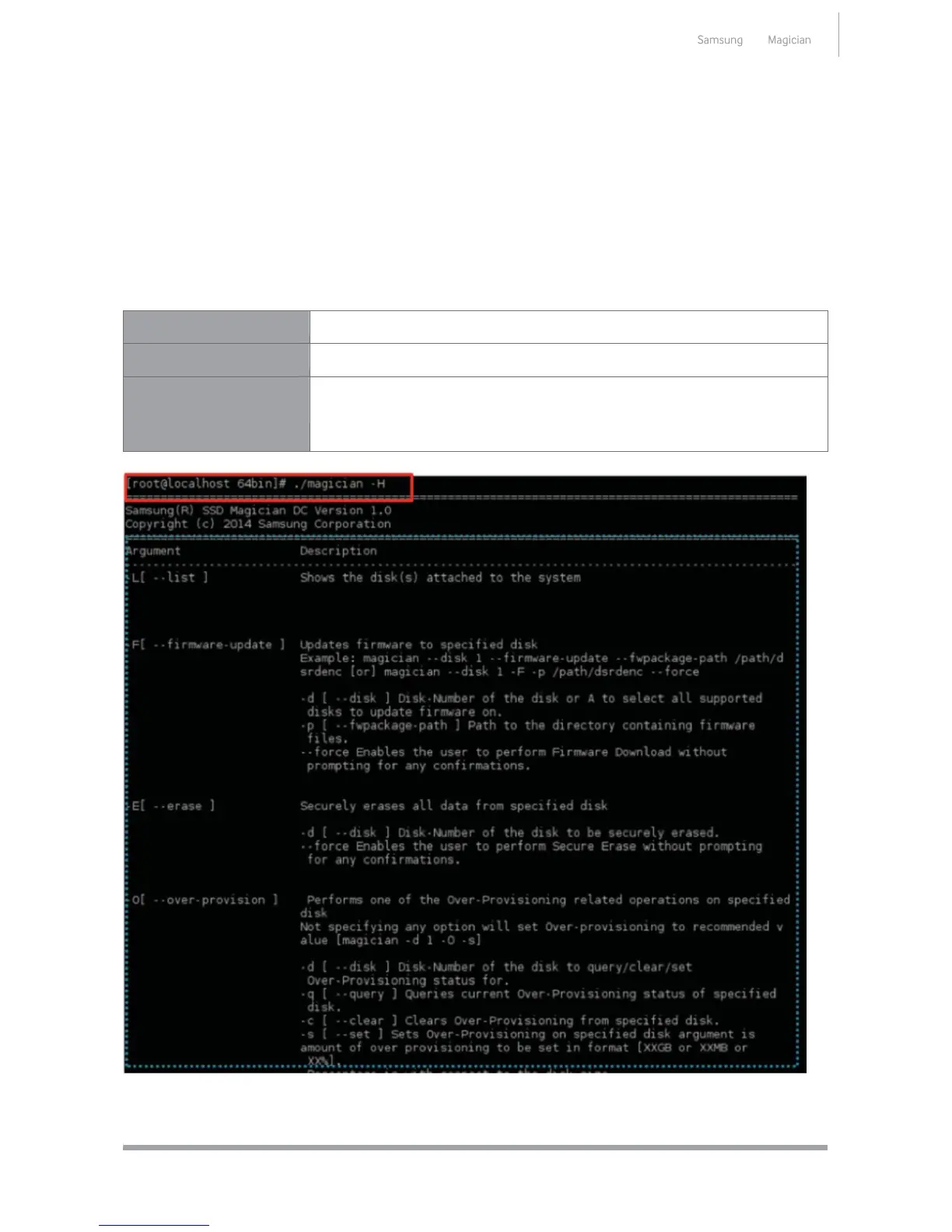 Display the command line options which are supported by Magician application.