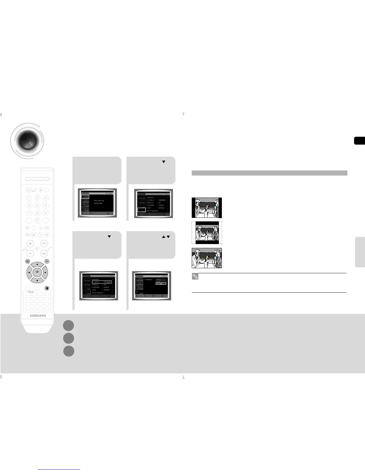 called the aspect ratio. When playing DVDs recorded in different screen sizes, you should adjust the aspect ratio to fit your TV or monitor.