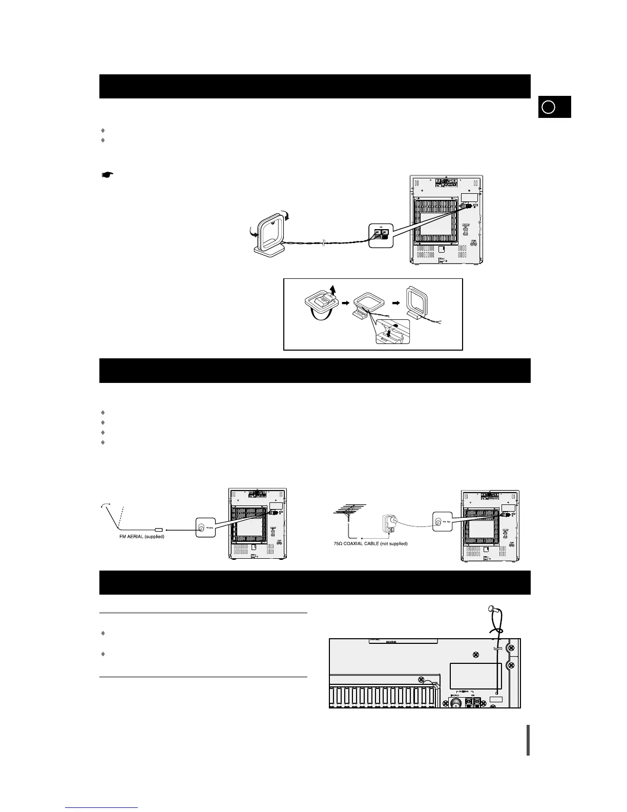 To do so, connect an outdoor FM aerial to the FM socket on the rear of the system using a 75Ω coaxial cable (not supplied).