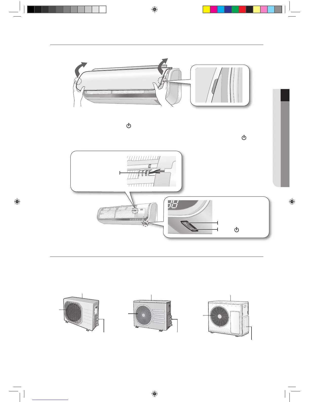 You may locate the Power button on the right bottom side of the air conditioner. If the front