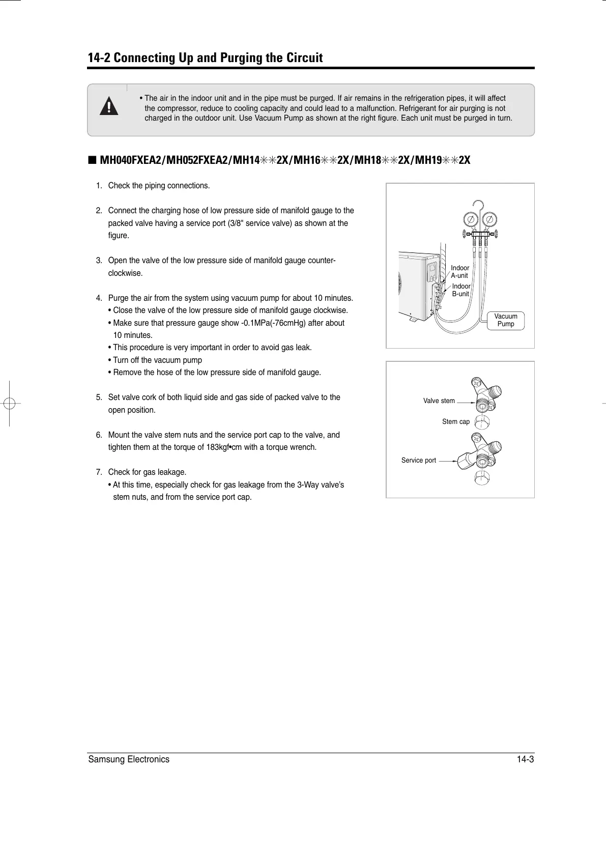 charged in the outdoor unit. Use Vacuum Pump as shown at the right figure. Each unit must be purged in turn.
