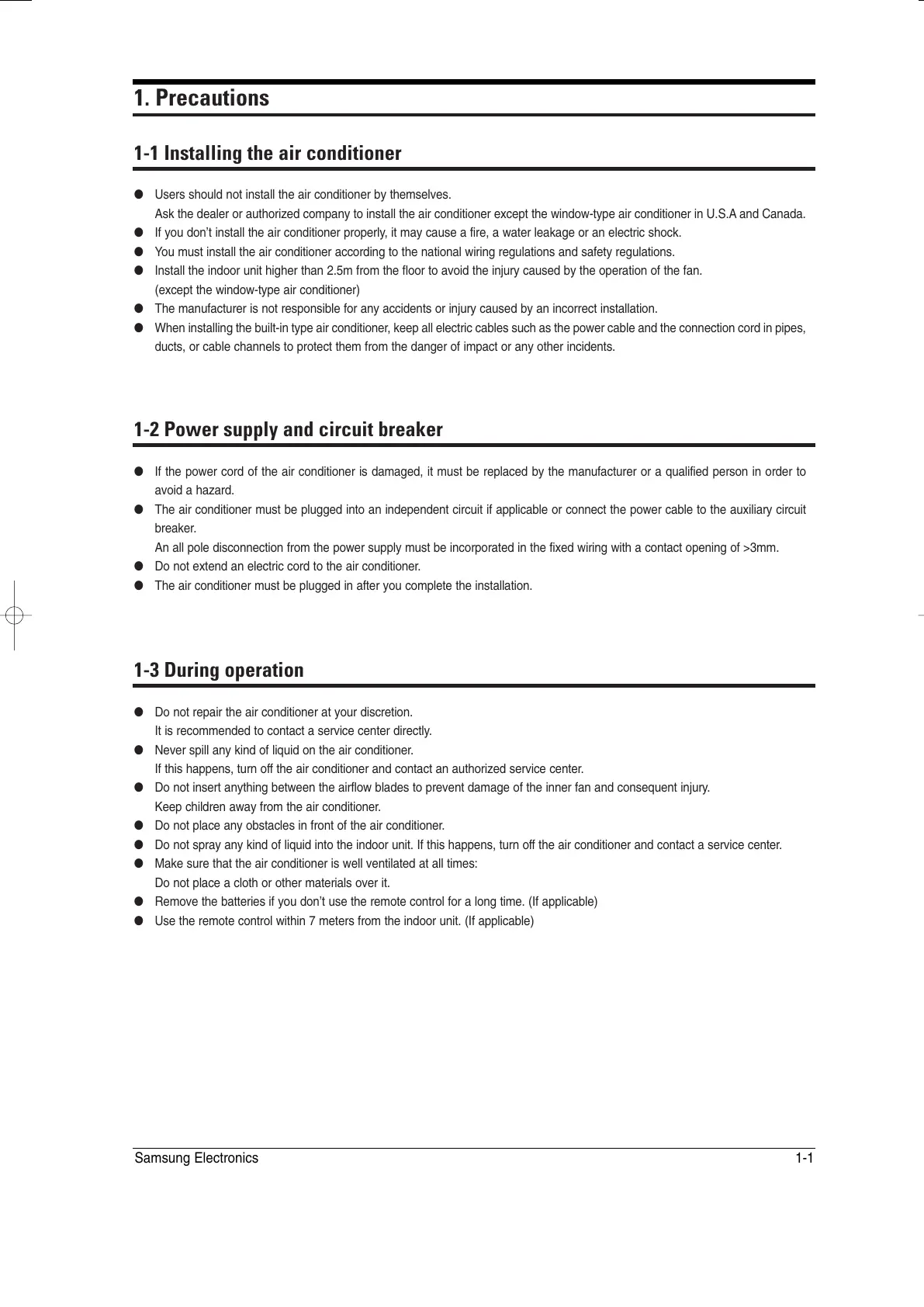 Ask the dealer or authorized company to install the air conditioner except the window-type air conditioner in U.S.A and Canada.