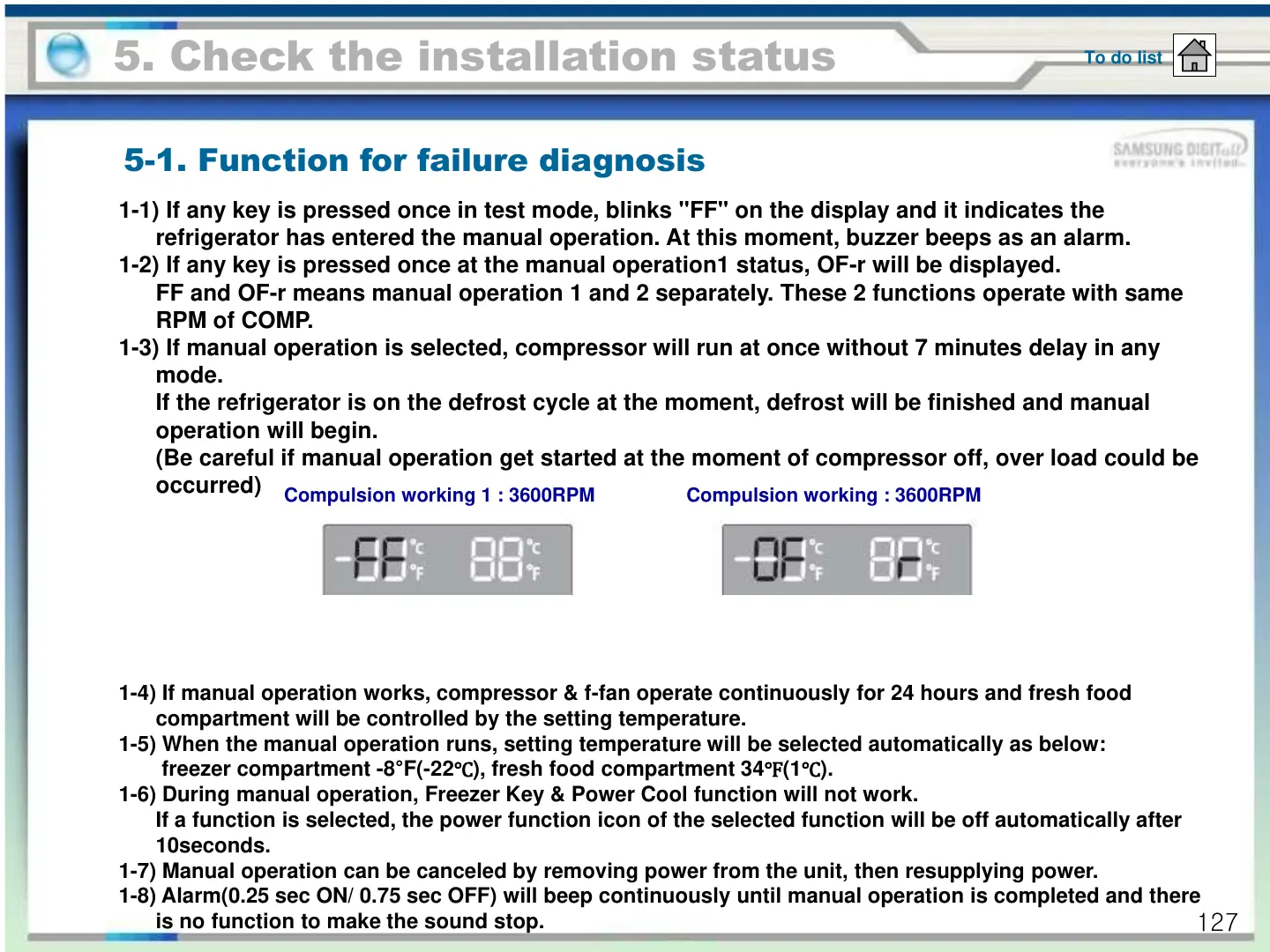 1-4) If manual operation works, compressor & f-fan operate continuously for 24 hours and fresh food
