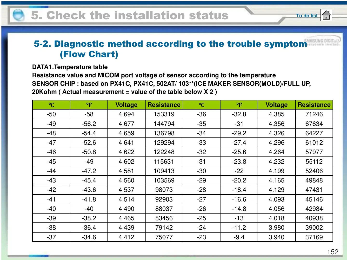 Resistance value and MICOM port voltage of sensor according to the temperature