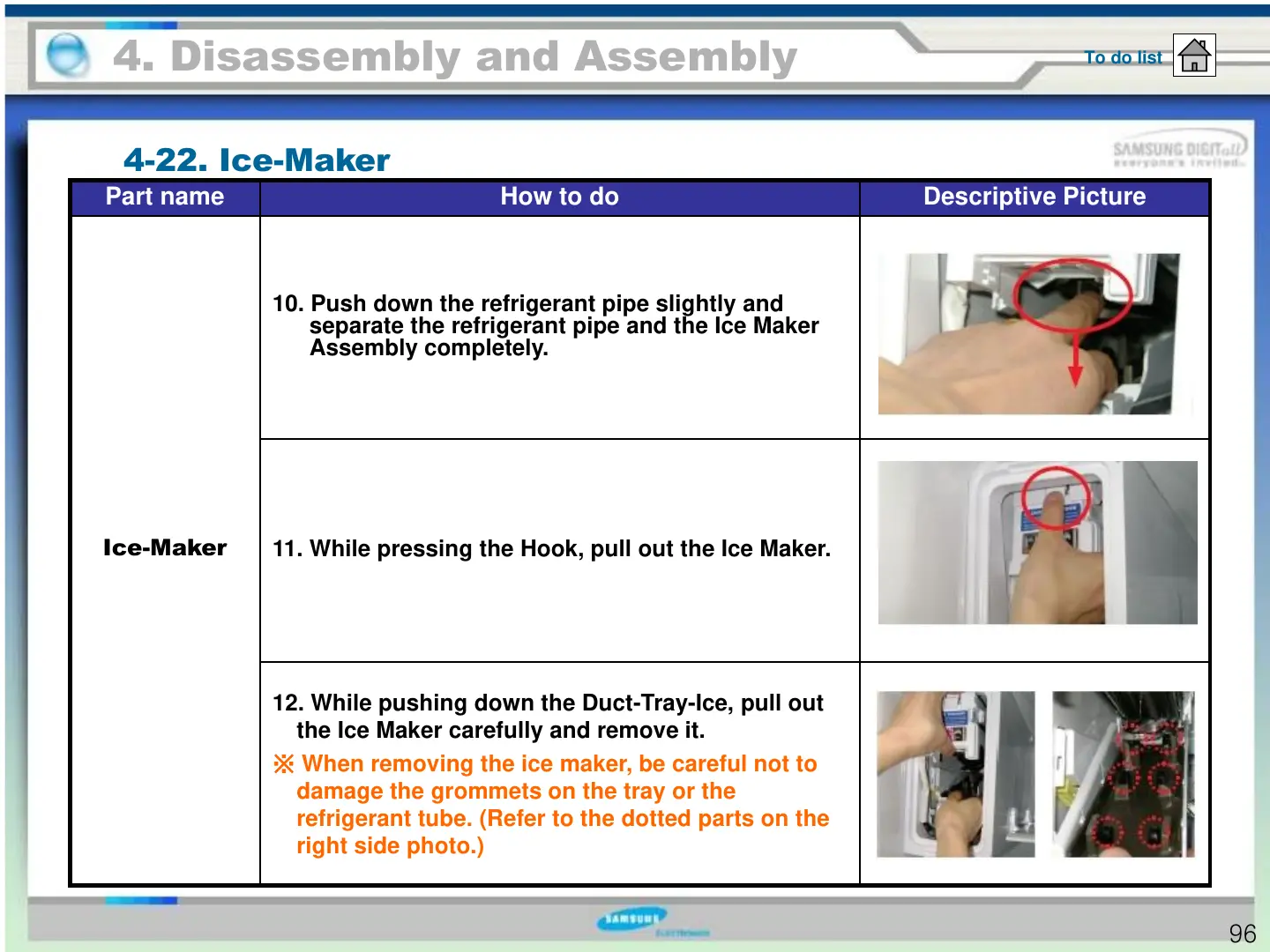 11. While pressing the Hook, pull out the Ice Maker.
