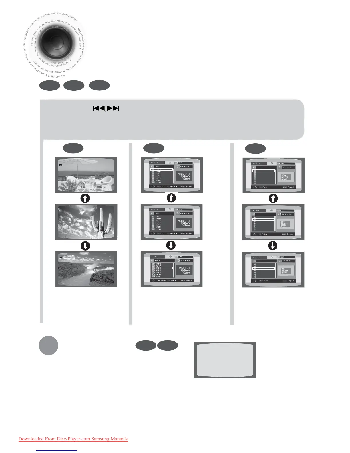 Each time the button is pressed briefly during playback, the previous or next chapter, track, or directory (file) will