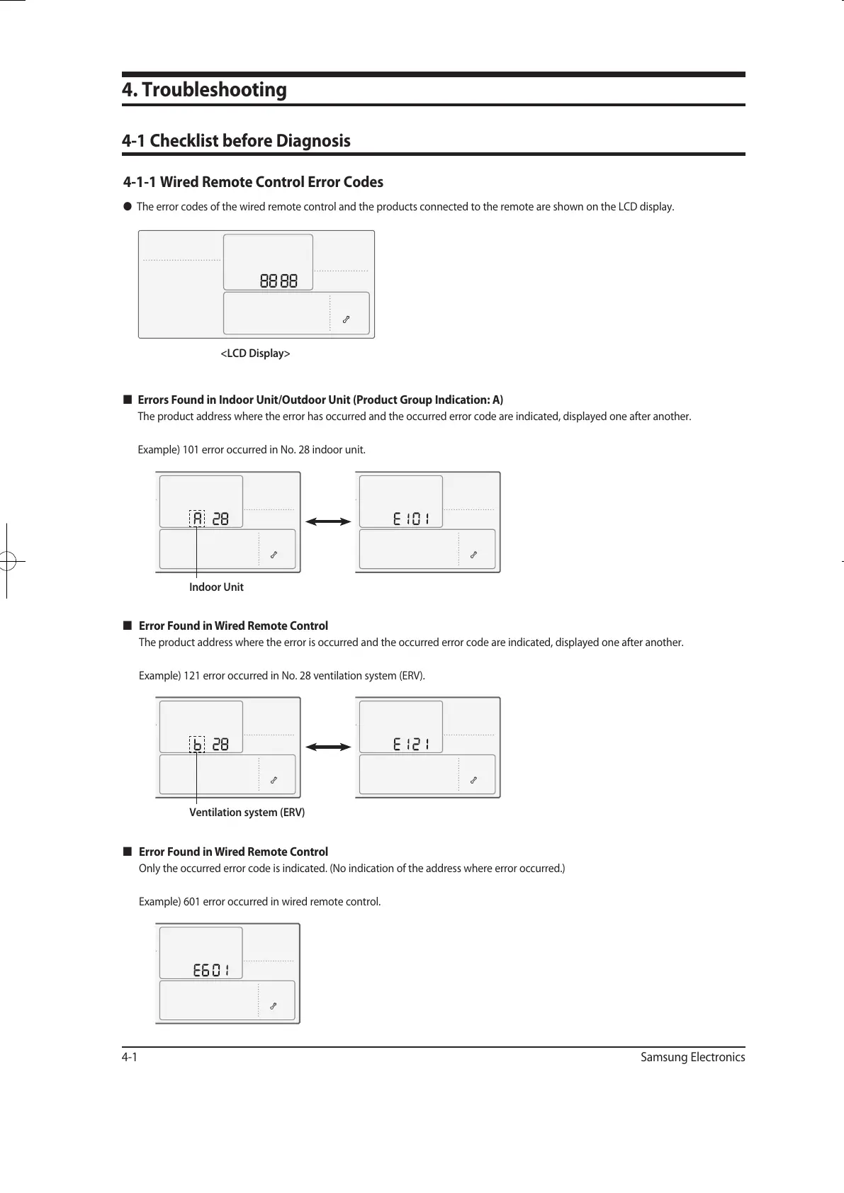 The error codes of the wired remote control and the products connected to the remote are shown on the LCD display.