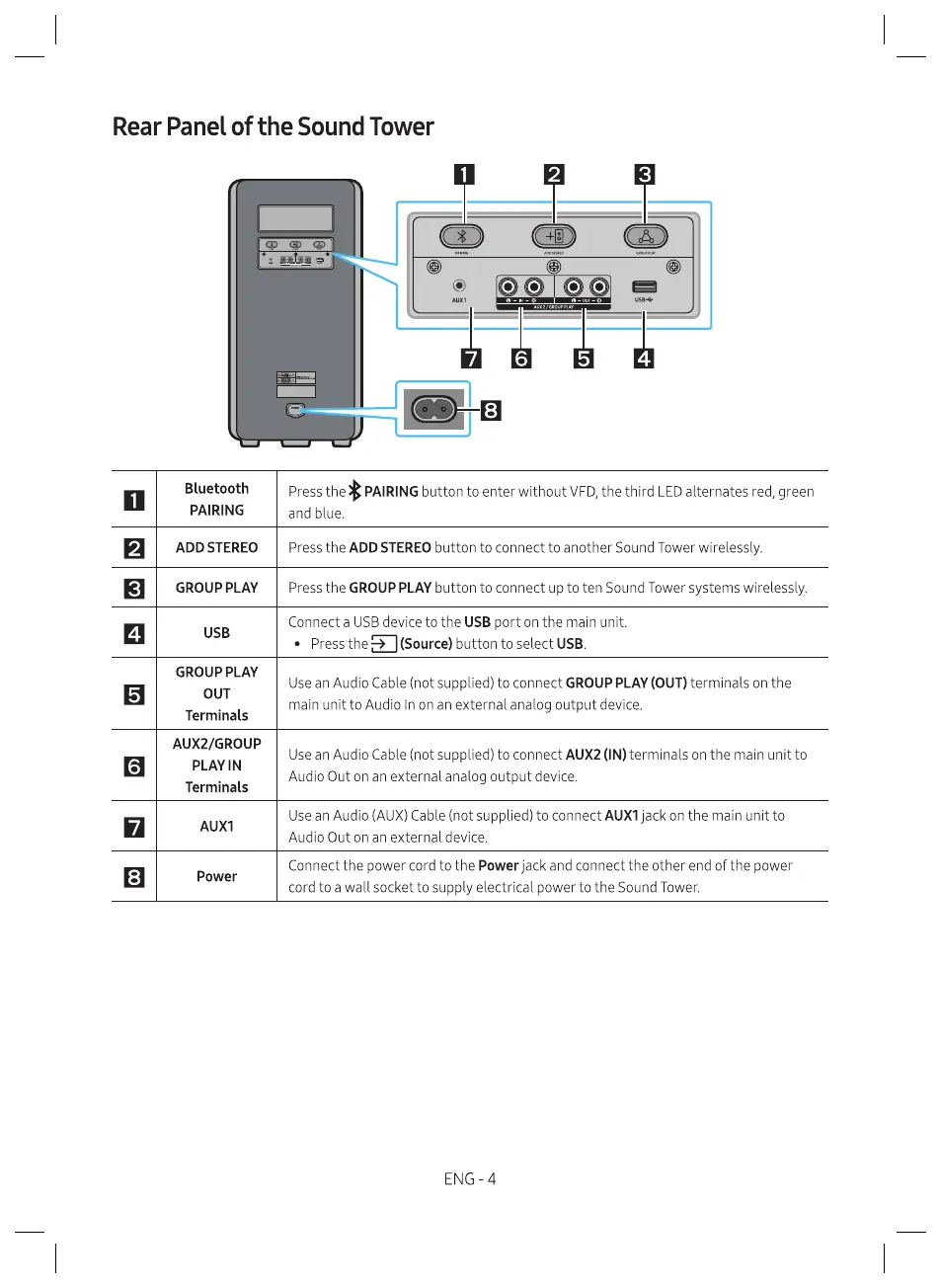 Samsung MX-ST40B - Rear Panel Connections; Bluetooth and Stereo Pairing; Group Play and AUX Terminals; Power Connection Port