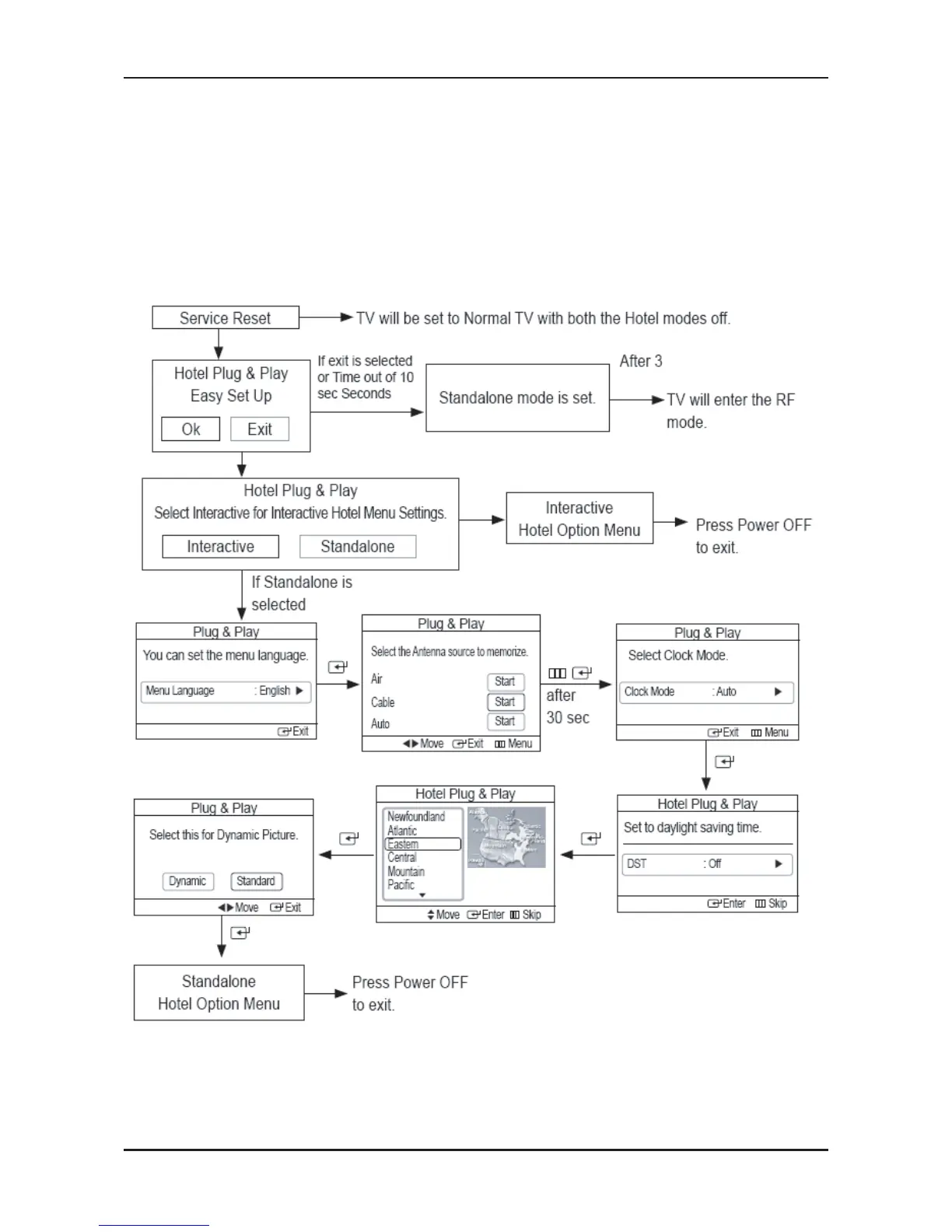 Hotel Plug & Play is a function that automatically performs the Hotel mode selection, Country Setup, Clock
