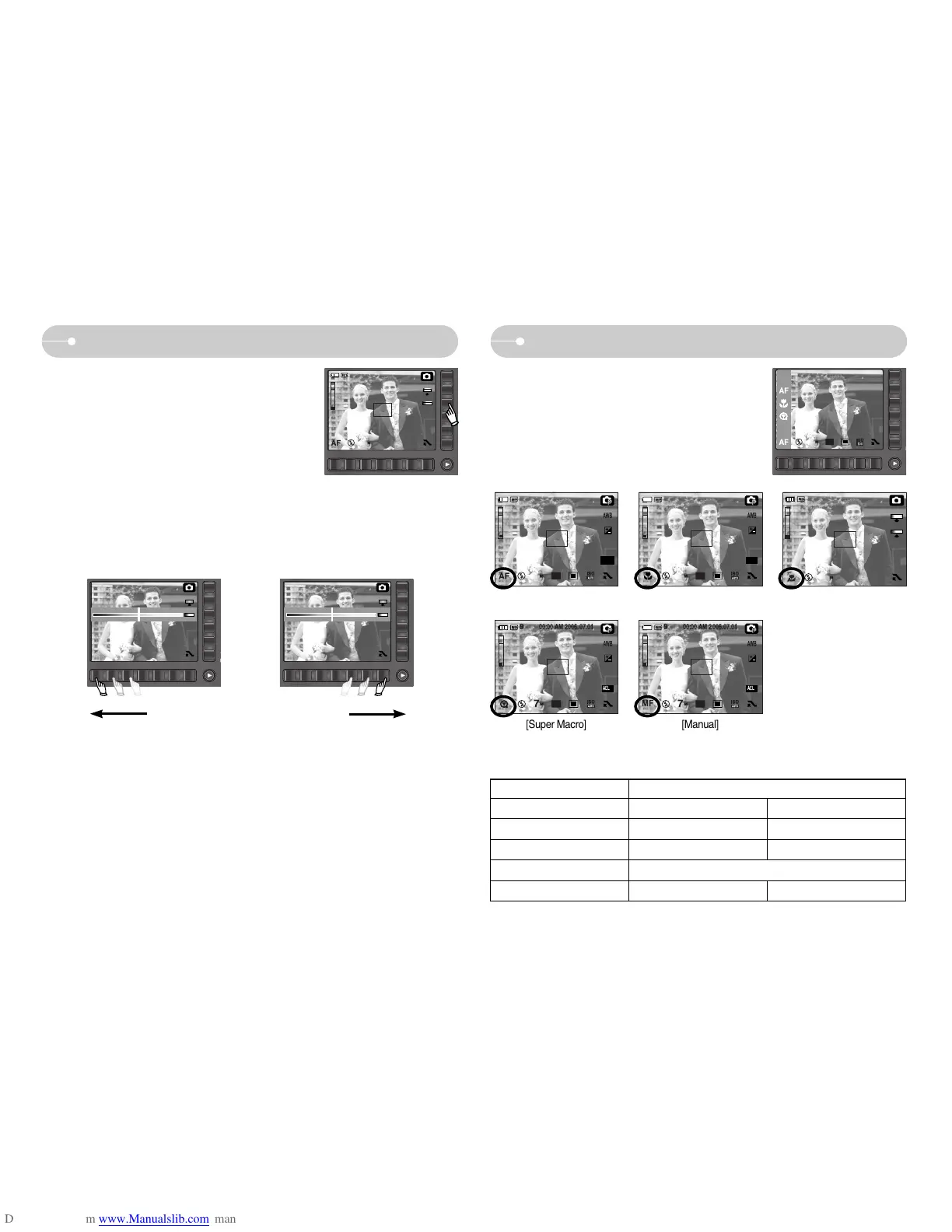 ƀ Types of focus modes and focus ranges (W : Wide, T : Tele) (Unit : cm)