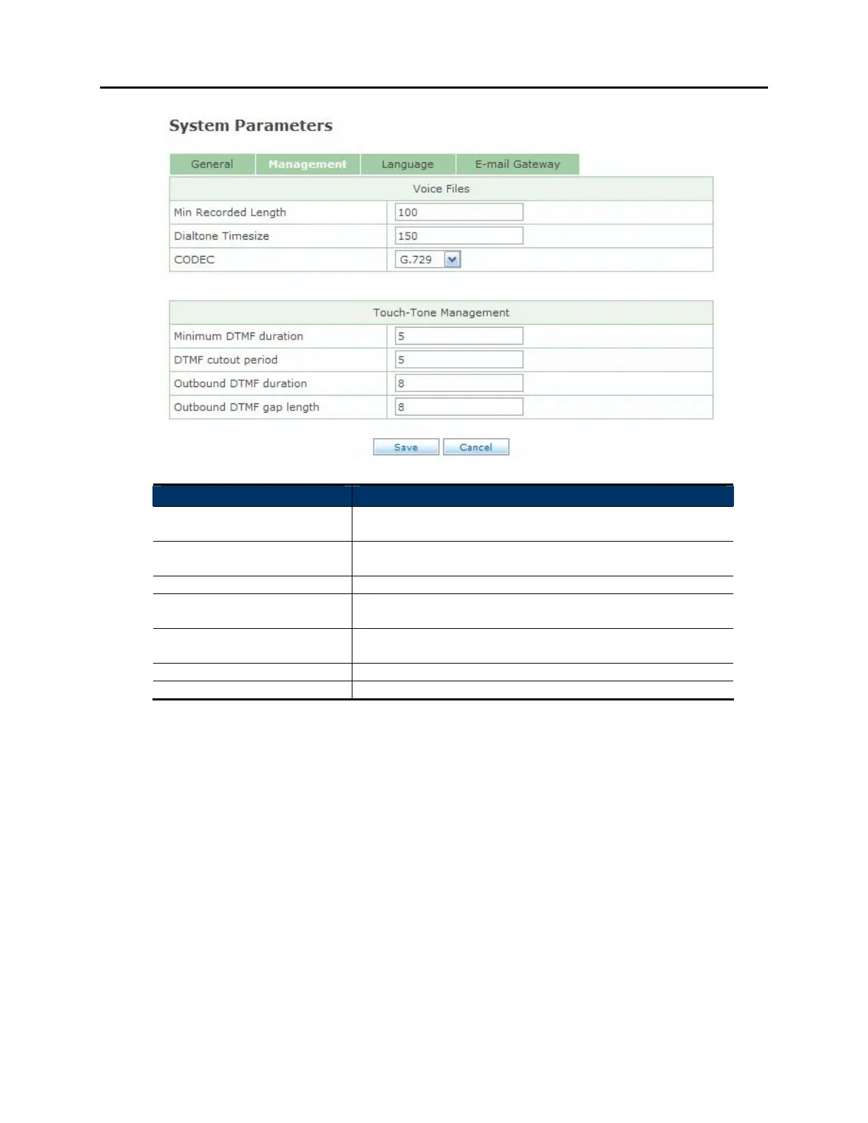 Outbound DTMF duration Sets the duration of DTMF digits sent by the system