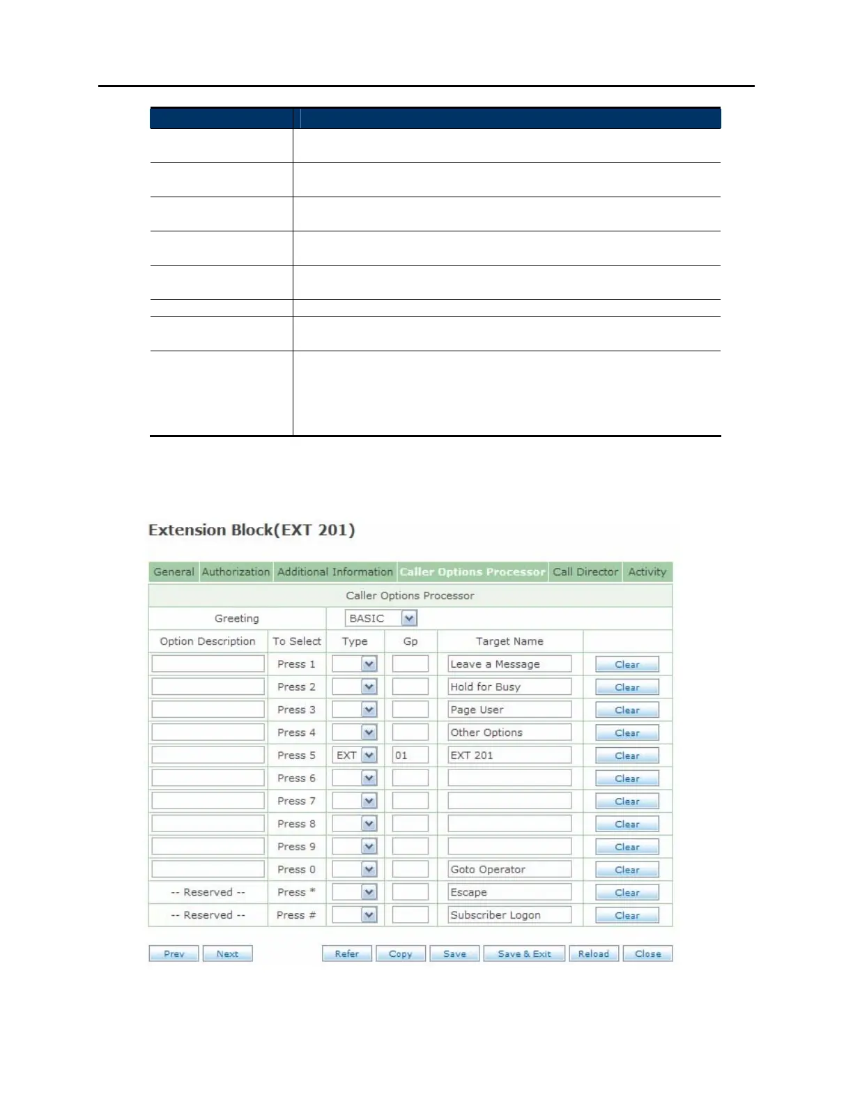 CALLER OPTIONS PROCESSOR SCREEN: