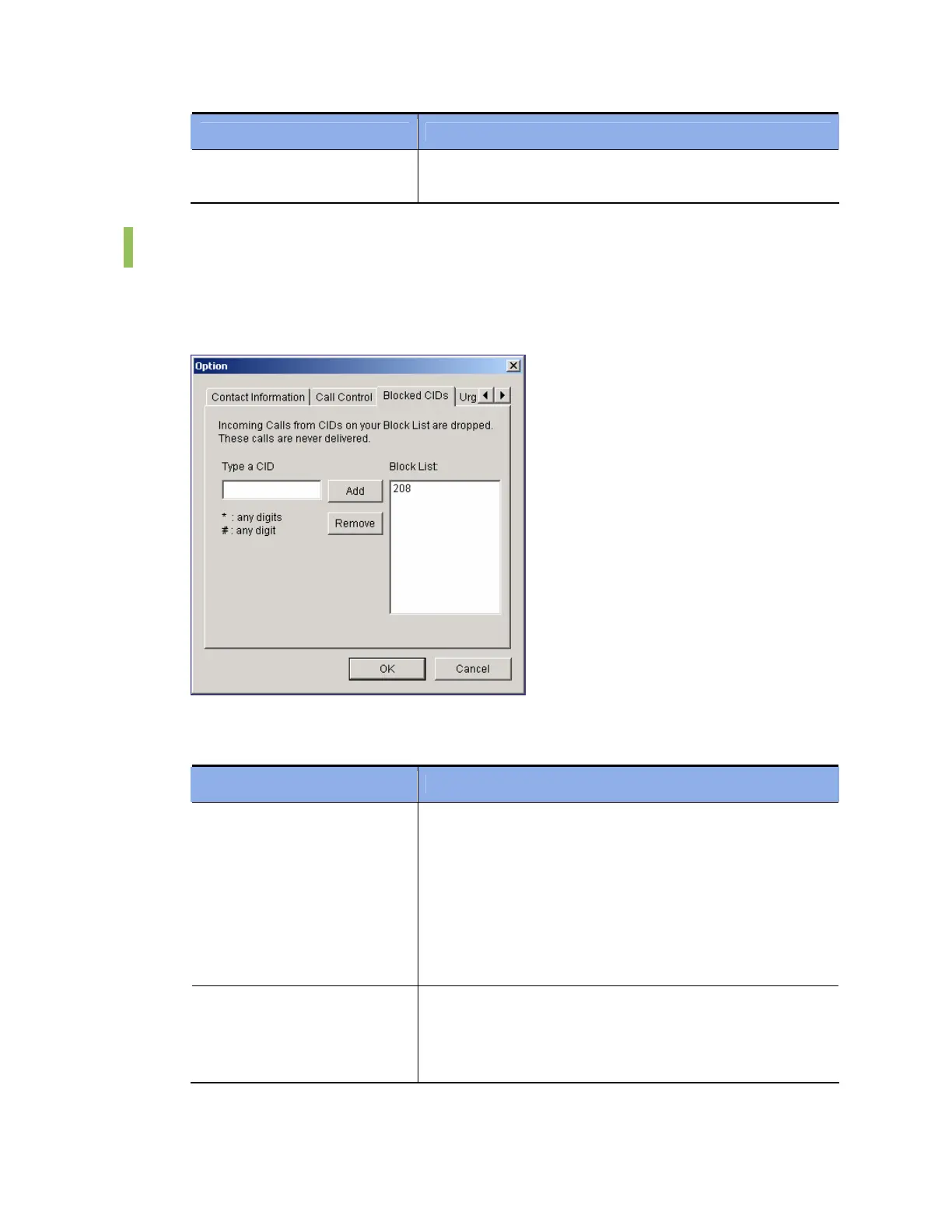 Parameters of the [Blocked CIDs] tab are described below: