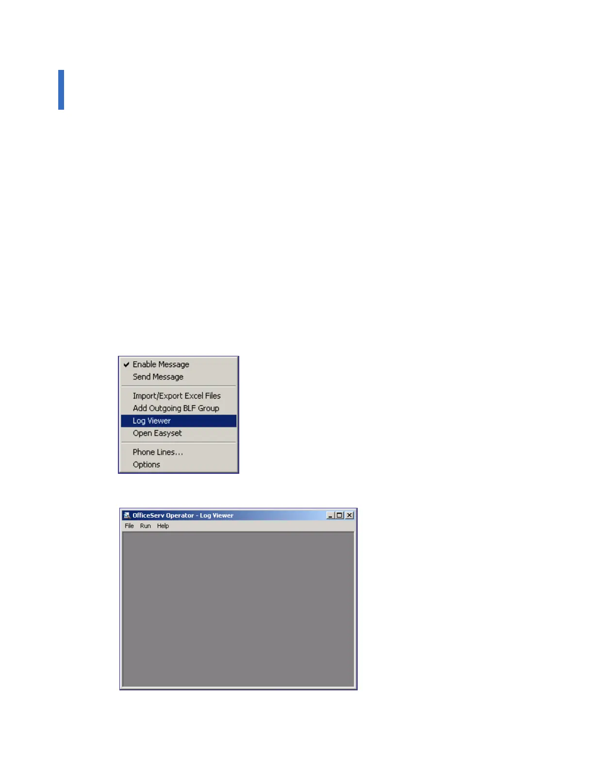 [Start]Æ[Programs]Æ[OfficeServ Operator]Æ[Log Viewer] from the Windows desktop to view